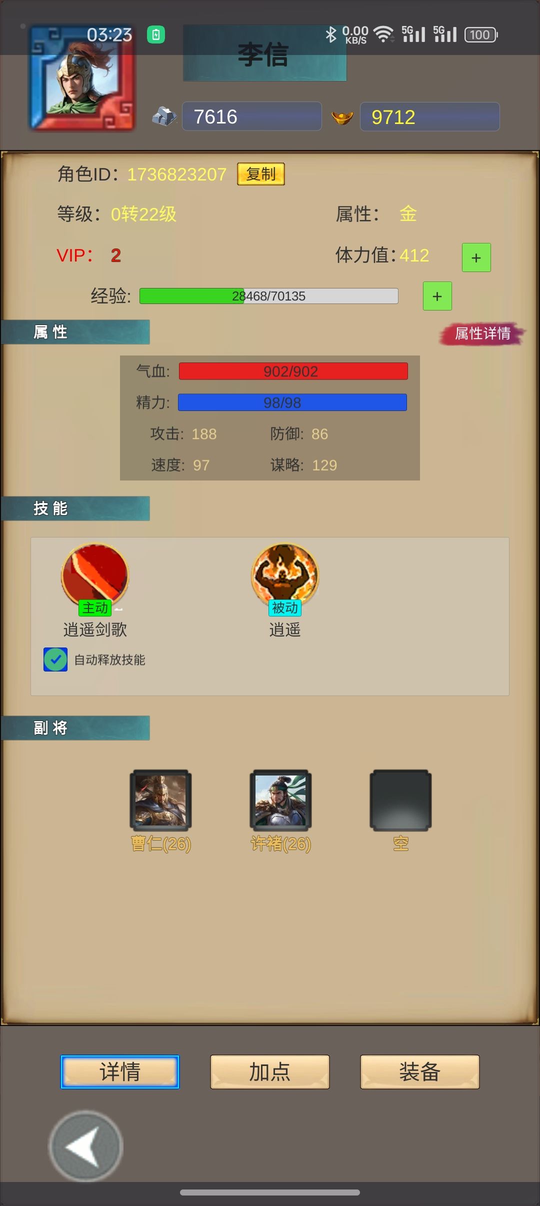 主角技能分为物理选择单体爆发技能逍遥剑歌路线。 开局属性,涉及气血、精力、攻击、速度、谋略五种属性分配,每种最多可以选择3次,每次选3种可以选5次。 主角走物理路线主加气血》攻击》速度》精力》》谋略 主角走谋略路线主加气血》谋略=精力》攻击》速度 ps气血第一是因为主将战斗中招将不会替换掉自己 升级到5级之后,进各个是隐藏的大佬。并且群主会不定时发放福利! 前期开荒主要靠副将,副将等级大于主将10