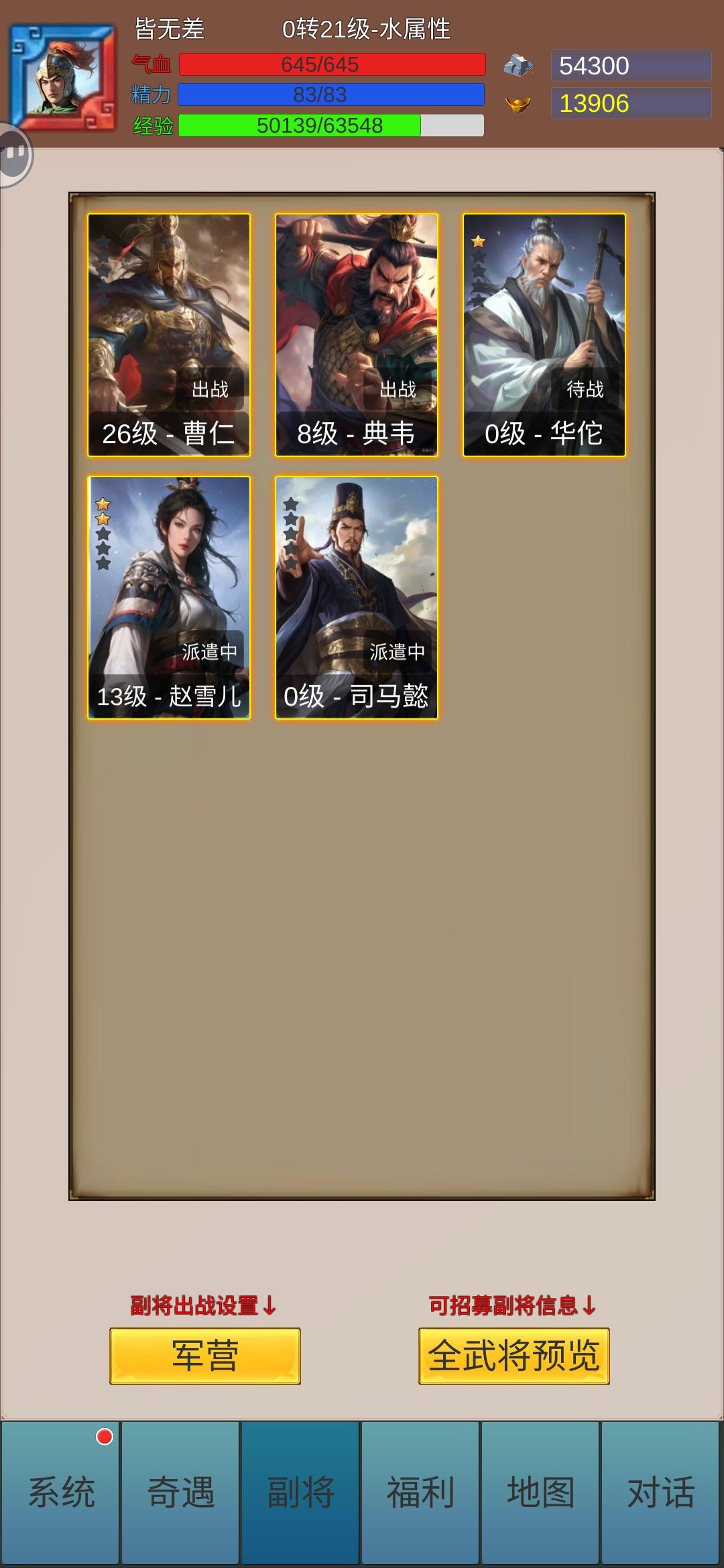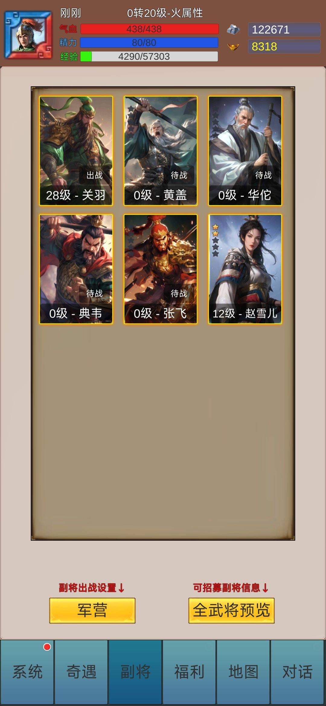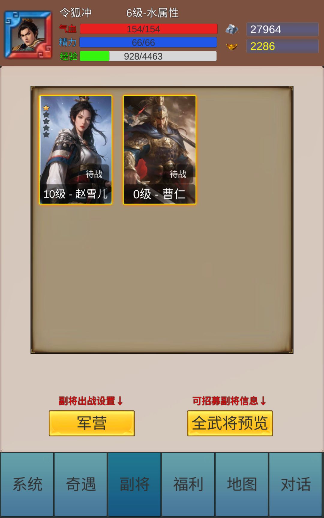 #龘龖三国 前期45级之前,副将建议赵雪儿+曹仁(1星以上才有用),破防和防御加成,前期全点血量,不然扛不住。赵雪儿开局自带,曹仁的话可以用招募抽,试炼会送一只,不建议抽转盘和自选名将。前期弄不到1星的话用华佗过渡也可以。 45级之后。副将建议吕布,典韦,甘宁,张辽+曹仁。曹仁是必备,星级越高越好,被动太优秀。建议还是能点血还是点血,要是快打不动可以试着武将洗回全攻,或者曹仁星级较高时可以武将都
