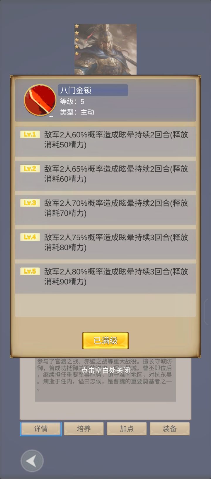 开局角色创建:五行选水,输出副将火属最多,水最有优势;属性优先速度>精神>攻击(谋略)>血。 角色技能选择:进游戏主线学技能谋略群体技能后期强,单体物理前中期好用,想玩久一点选谋略群伤,开局这个谋略群伤技能是真的弱,三十之前基本没有加谋略的装备,要套装麒麟套才开始崛起,可以选择人员不放技能属性加攻击血量过度,后期再洗属性点。图五十面埋伏就是技能效果,后期配合吕布马超貂蝉一回合秒全部。 资源:一