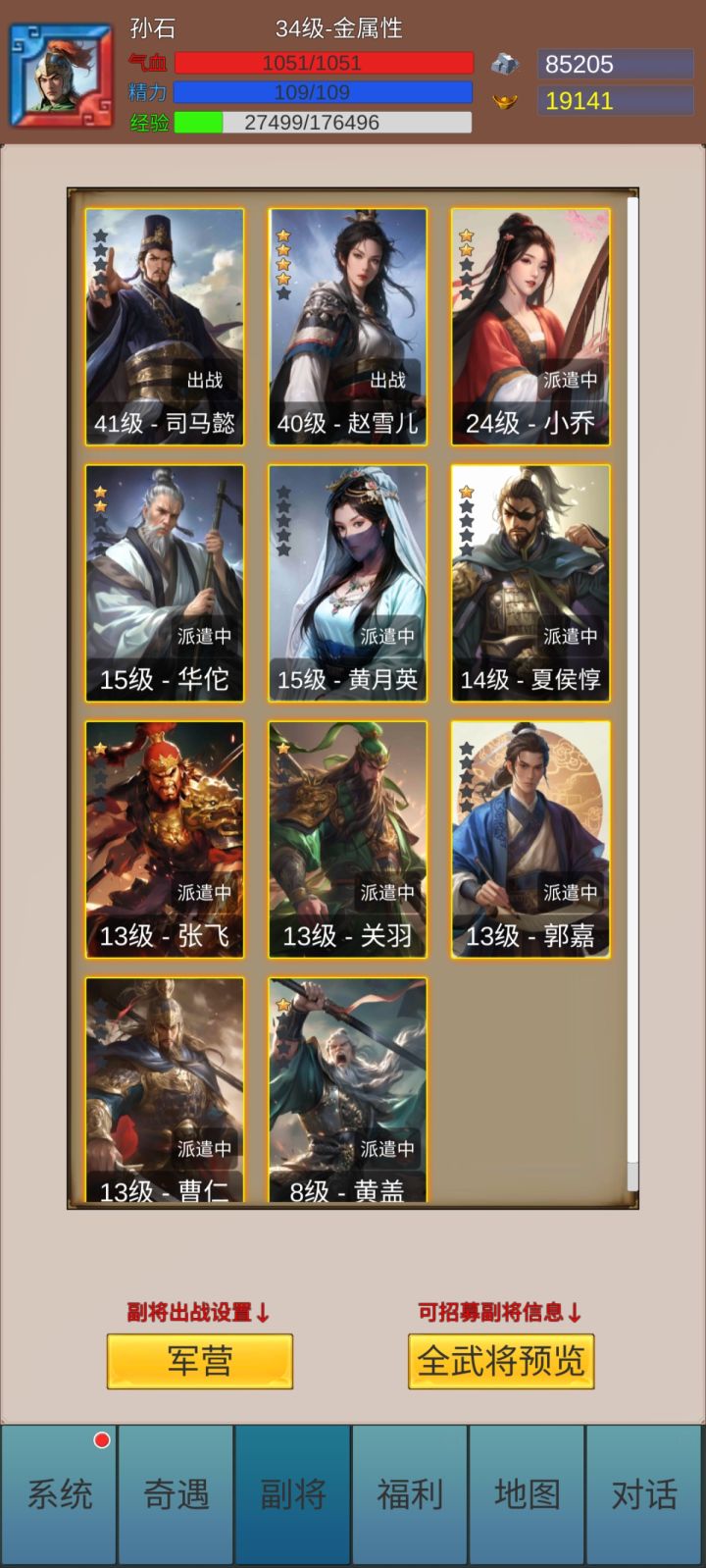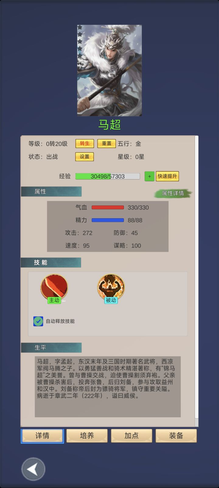 开局角色创建:五行选水,输出副将火属最多,水最有优势;属性优先速度>精神>攻击(谋略)>血。 角色技能选择:进游戏主线学技能谋略群体技能后期强,单体物理前中期好用,想玩久一点选谋略群伤,开局这个谋略群伤技能是真的弱,三十之前基本没有加谋略的装备,要套装麒麟套才开始崛起,可以选择人员不放技能属性加攻击血量过度,后期再洗属性点。图五十面埋伏就是技能效果,后期配合吕布马超貂蝉一回合秒全部。 资源:一