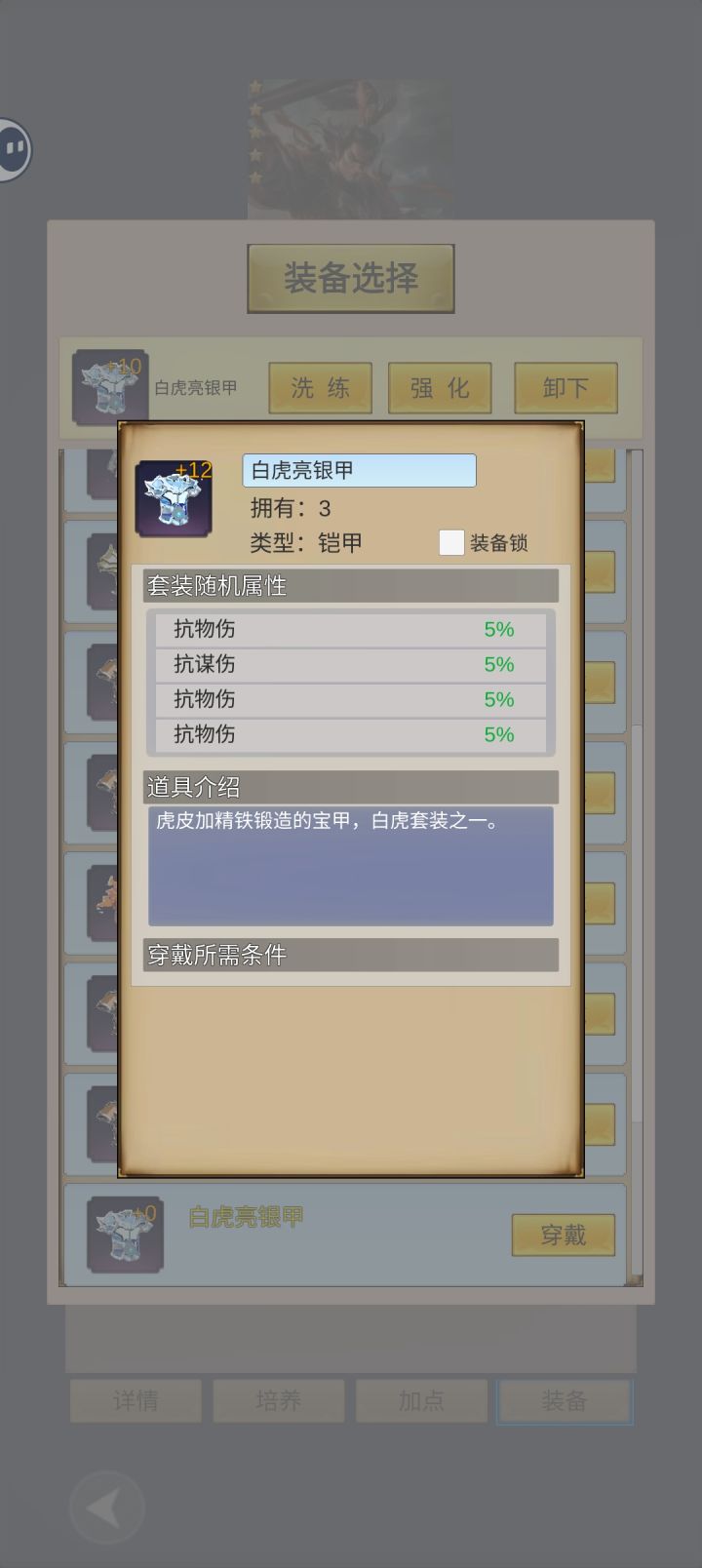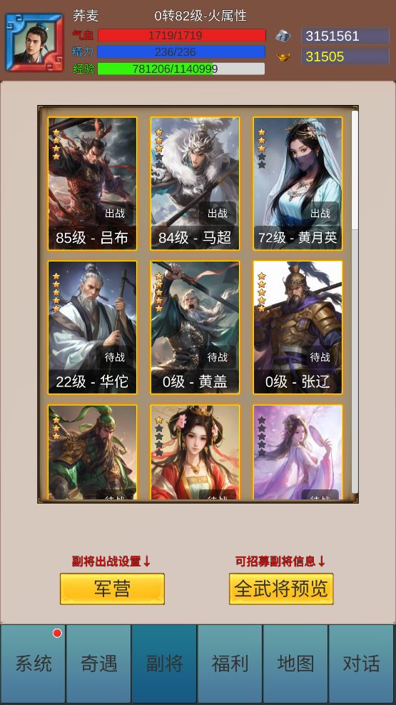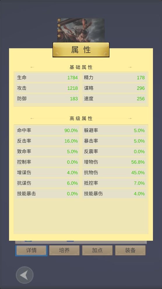 开局角色创建:五行选水,输出副将火属最多,水最有优势;属性优先速度>精神>攻击(谋略)>血。 角色技能选择:进游戏主线学技能谋略群体技能后期强,单体物理前中期好用,想玩久一点选谋略群伤,开局这个谋略群伤技能是真的弱,三十之前基本没有加谋略的装备,要套装麒麟套才开始崛起,可以选择人员不放技能属性加攻击血量过度,后期再洗属性点。图五十面埋伏就是技能效果,后期配合吕布马超貂蝉一回合秒全部。 资源:一