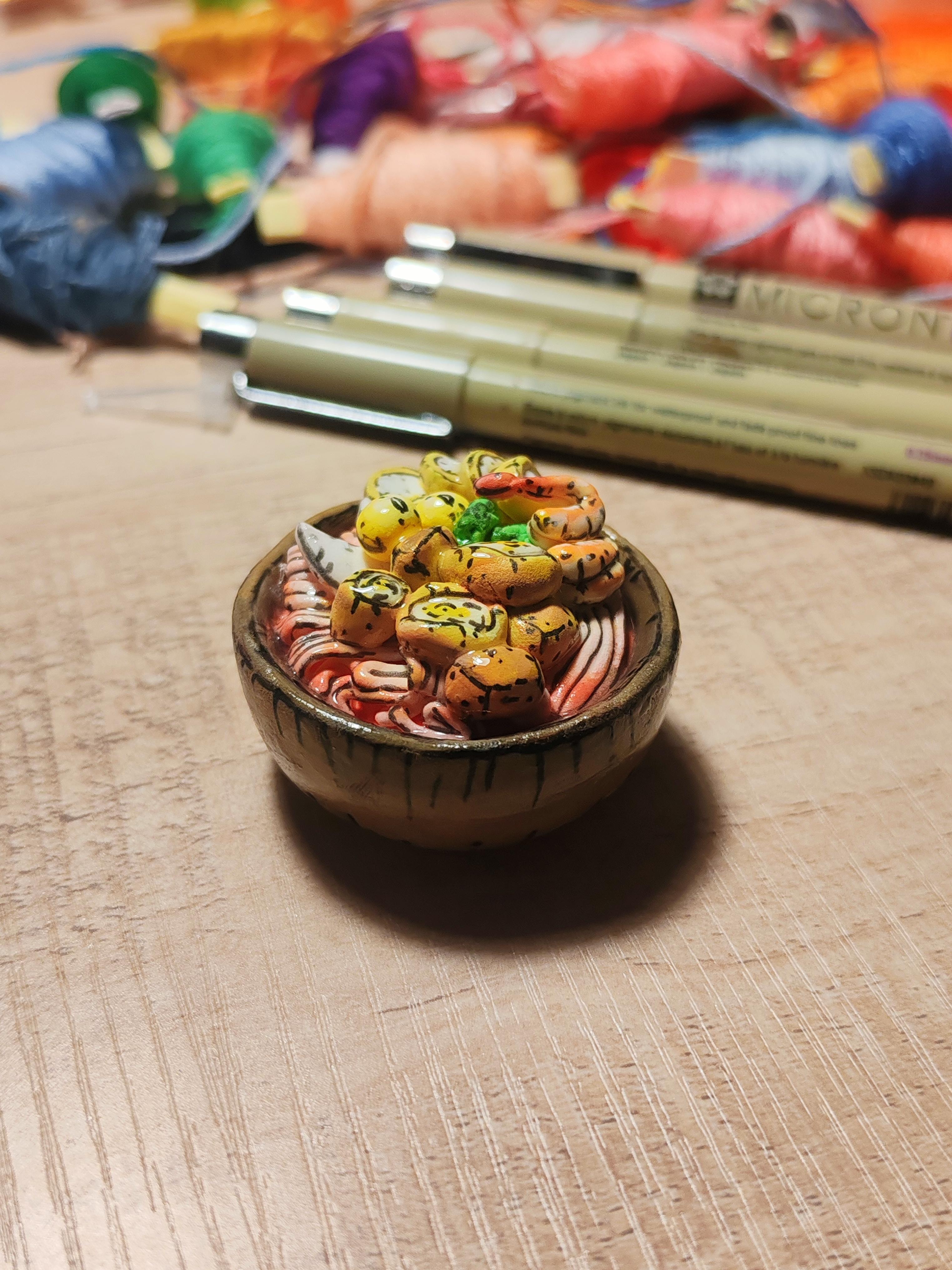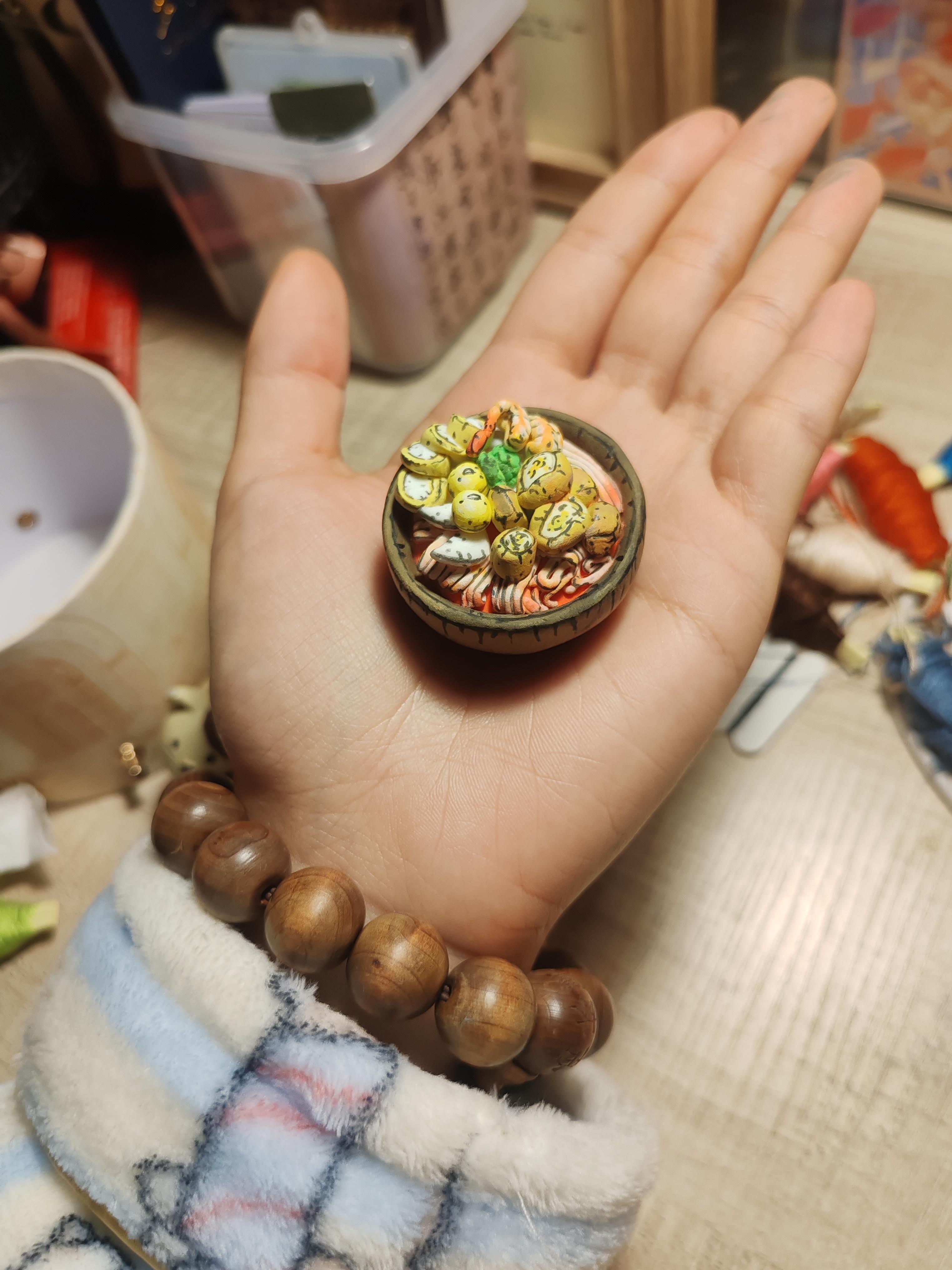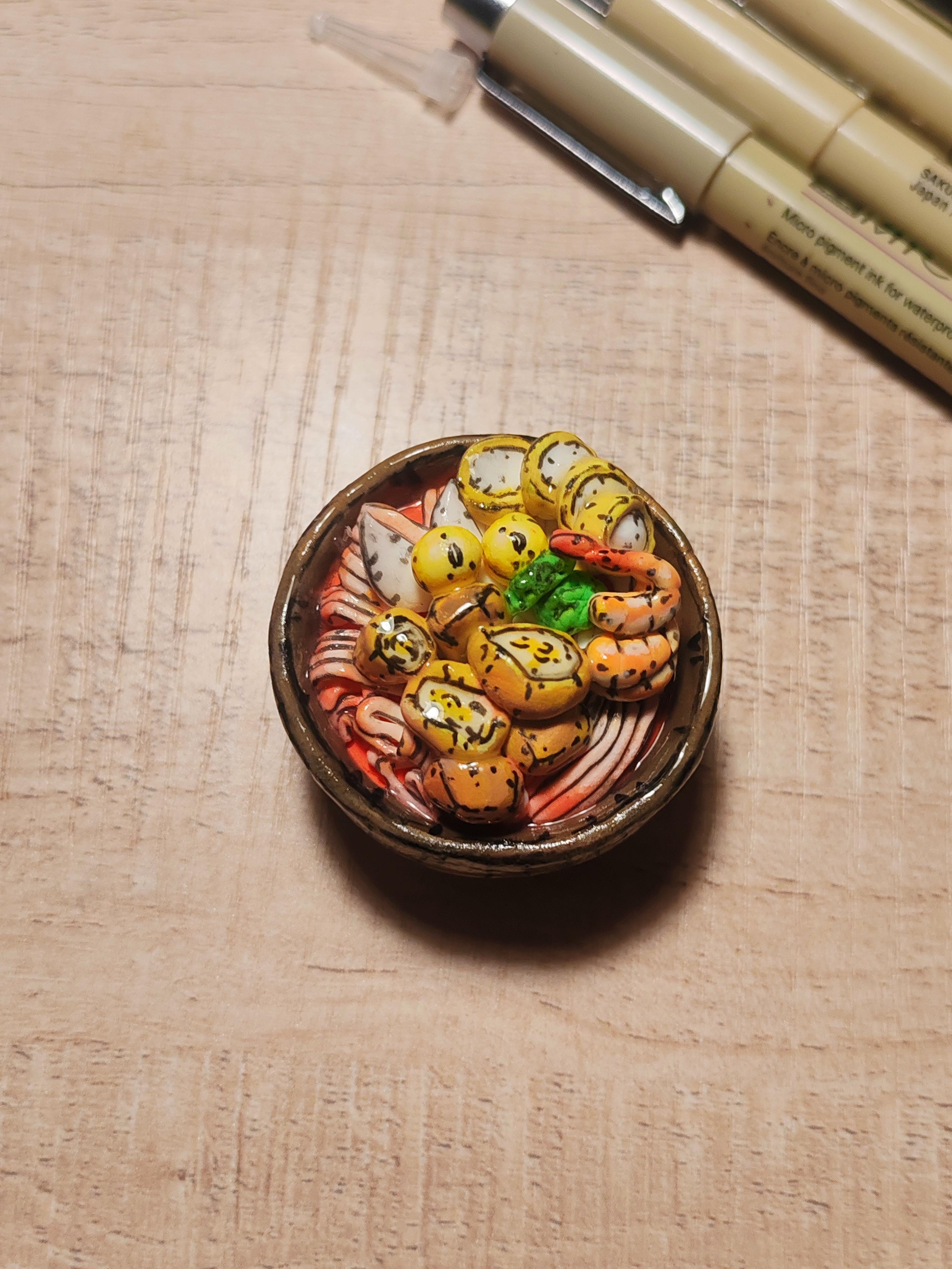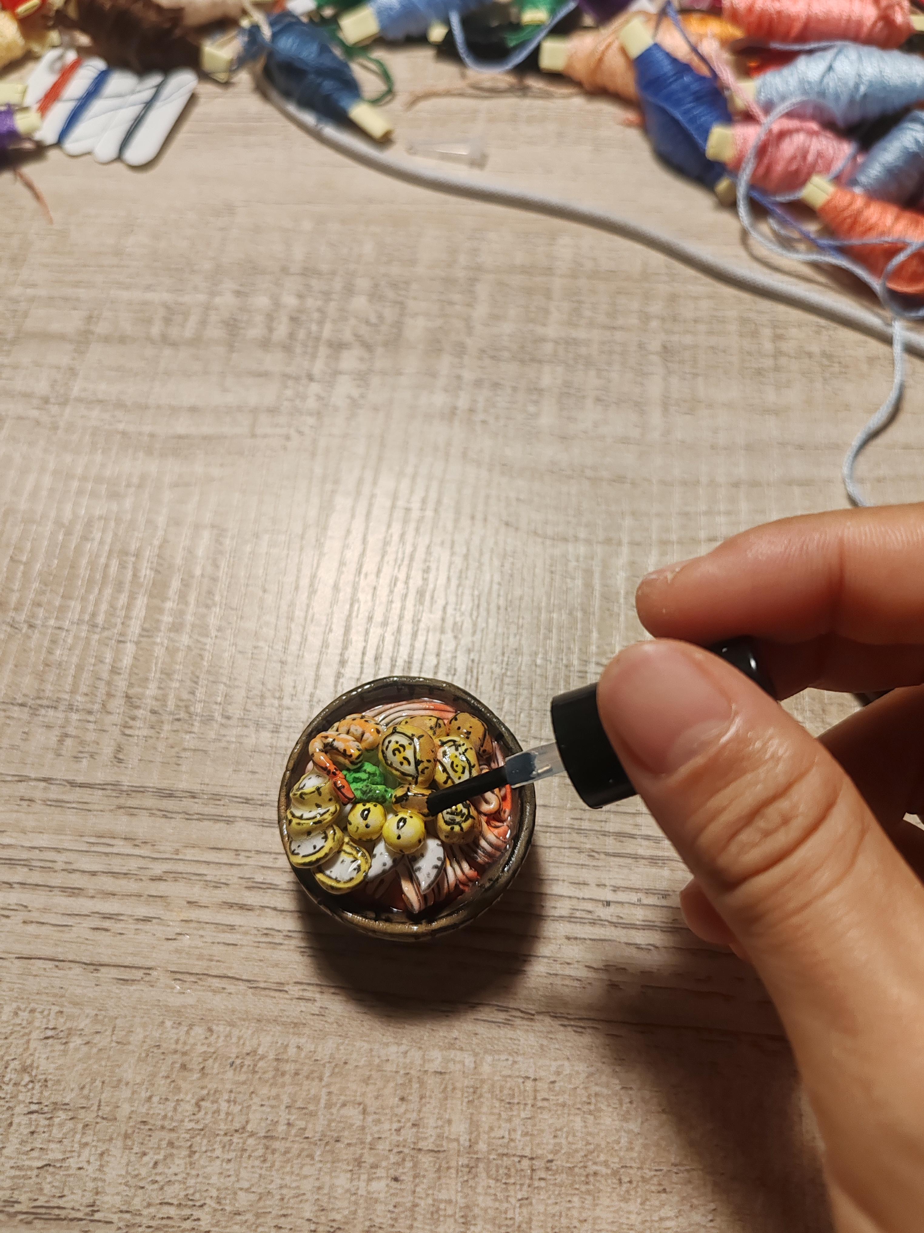 之前一直配不出来叻沙的配方,因为根本没吃过这个菜,很巧的是十月底去新加坡研学了一周,正好吃到了叻沙!有一种游戏和现实交汇的感觉!也是因为吃到了实物我才知道了这道菜的组成究竟是什么,黑料真的是一个非常好的游戏🥰所以从新加坡回来以后就开始做叻沙的小模型,今天终于把最后的勾边做完,涂上了亮油😘樱花的笔好用且防水,但是很不耐用,都已经用完七八根了,想换牌子又担心别的勾线笔会被亮油晕开😵💫#黑暗料理王2