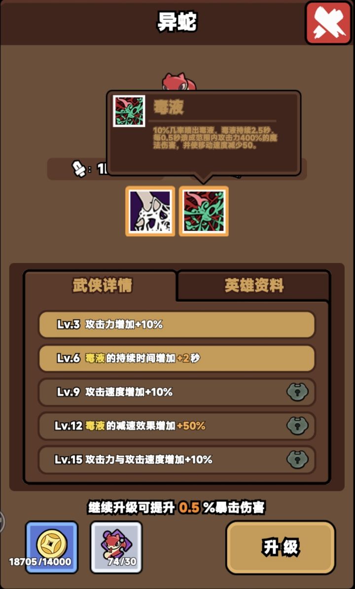 首先是阵容,聚宝杂役(5%+10金币)、异蛇(减速+毒)、毒蛤(群3+10%眩晕)、骰龙(幸运护符收益)、寒玉谪仙(主攻)、醉梦客(主攻)、降龙丐(群体加速+群体减防)。 开局先搞3-6个6级的聚宝杂役保证银币收益,然后强化召唤概率到满,然后合金色人物基本就差不多了,主要有些要升6级激活技能。 主要升级的看图,就这些吧。ID:409321 菩提树与明镜台 可以带过双难道80。