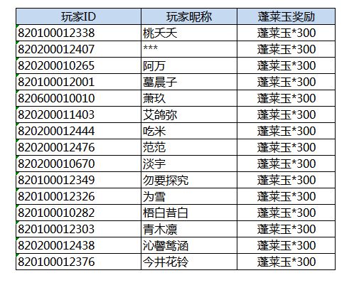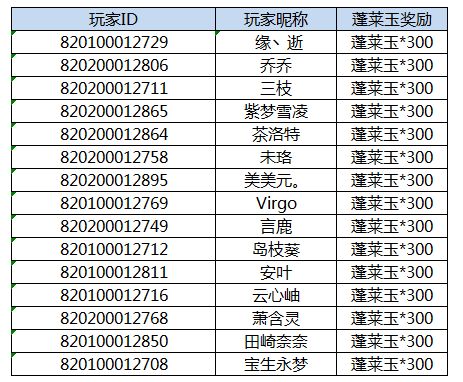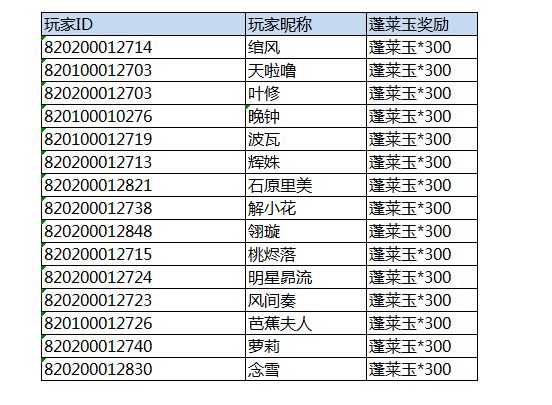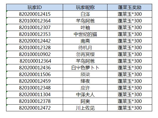 又到了周五发奖励的时间啦!一起来看看本期又有哪些小可爱中奖了吧!本期奖励名单如下:恭喜以上小伙伴获得蓬莱玉(免费)*300,奖励将通过邮件直接发放。还请小伙伴们注意邮箱提示。【注意事项】1.蓬莱玉奖励将于开奖帖公布后的7个工作日发放,若长时间未收到蓬莱玉奖励。请及时联系我们的运营同学(QQ:3452571670)并提交QQ号,账号ID等相关信息,我们会尽快补发。2.蓬莱玉补发有效时间至本