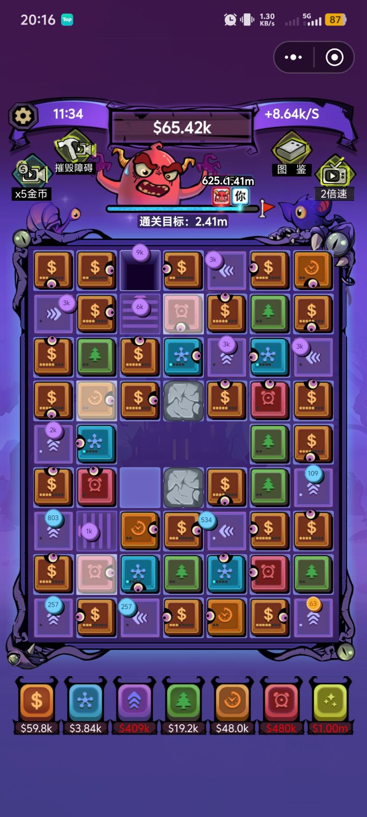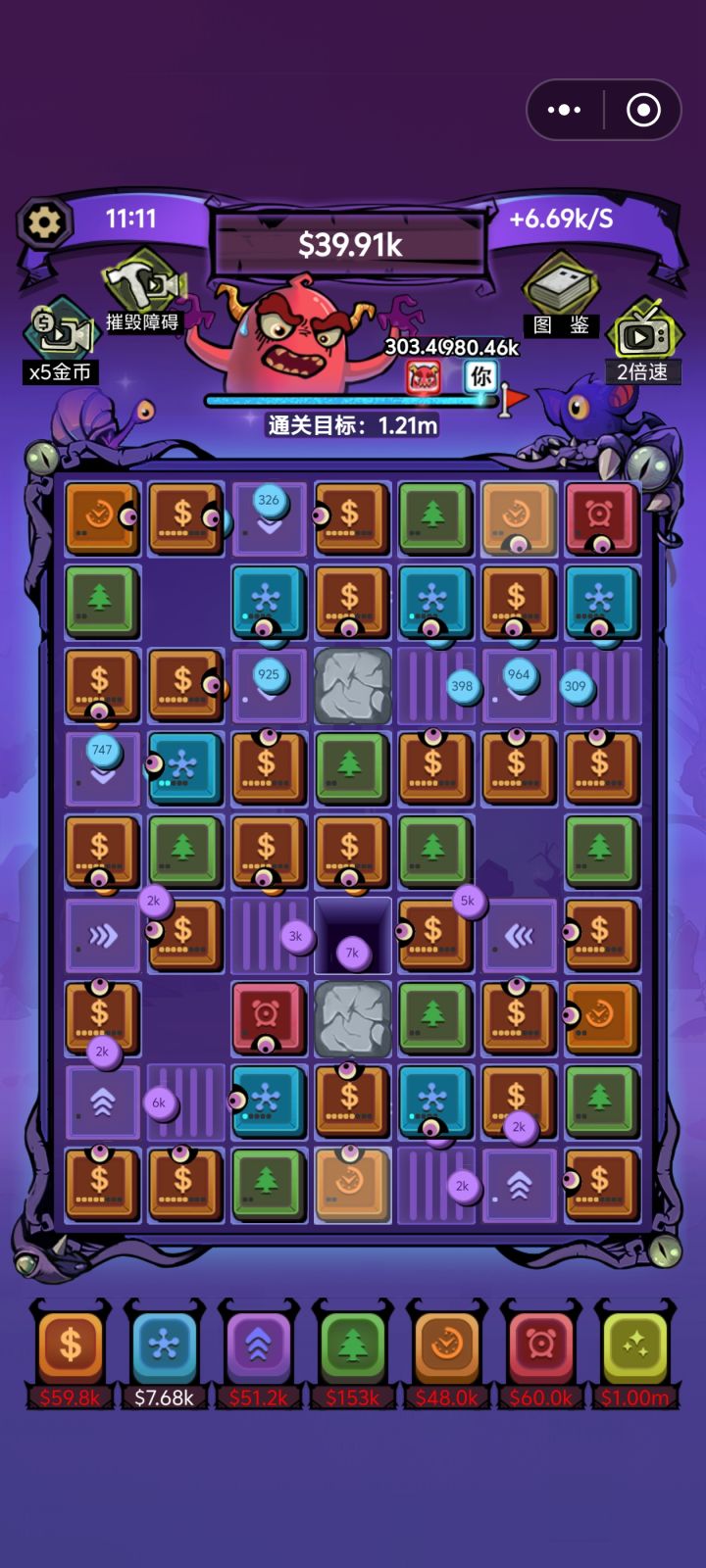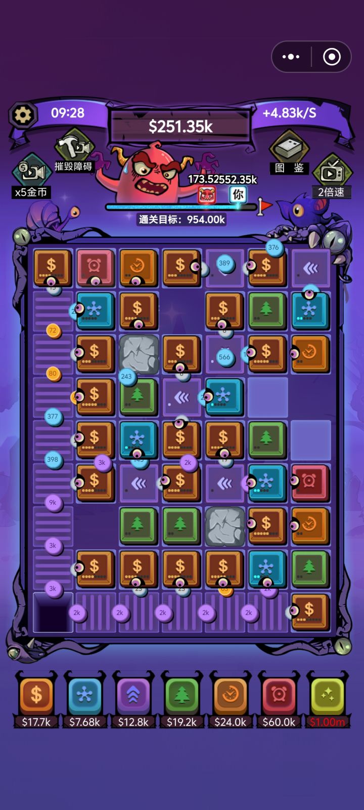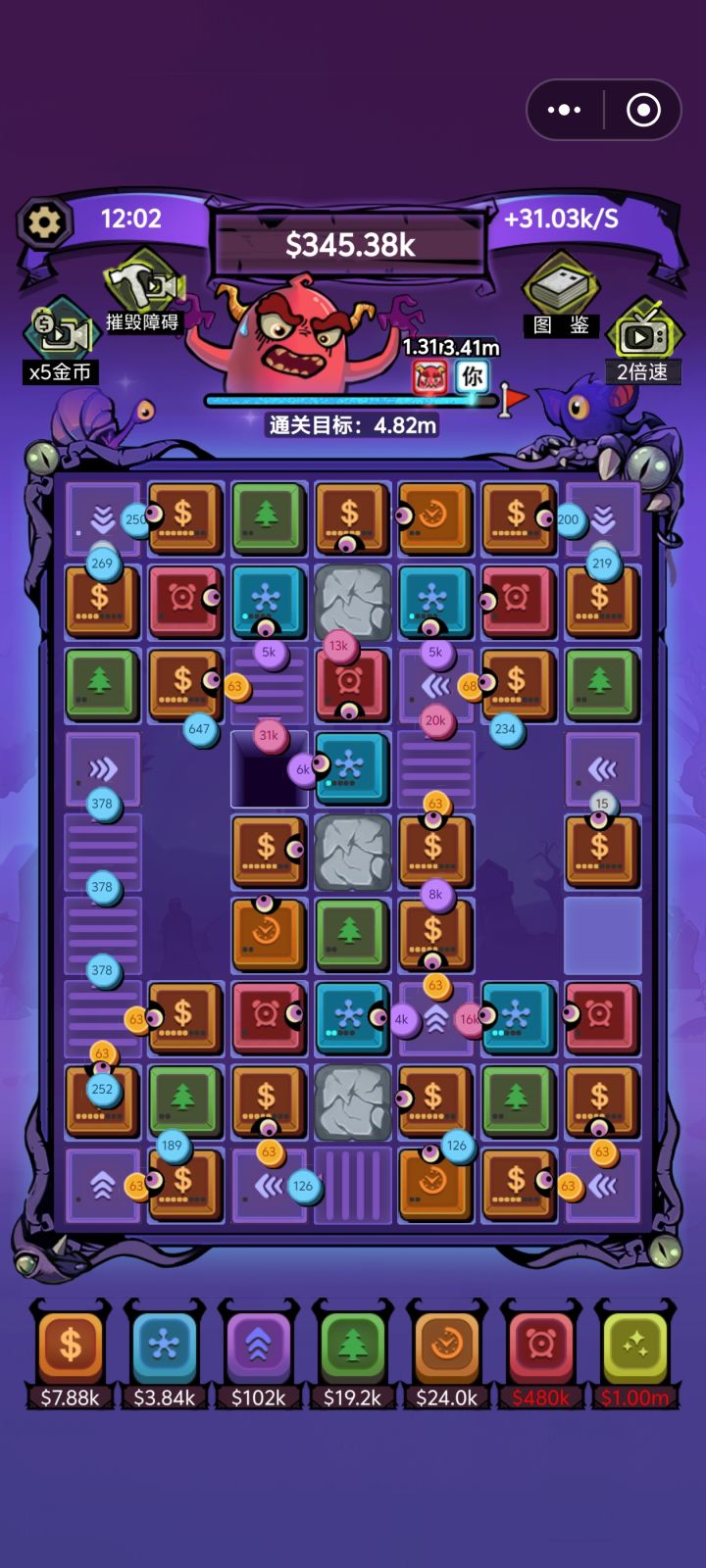 不看广告也是可以通关的,就是前期比较坐牢,看去石头的广告就足够,否则地图资源利用起来比较困难,不看广告前期就蹭+几的格子 旁边摆个核心,然后去养可以共同享用的一个工厂,加钱格子打工存到3K后加速给可以双吃的工厂,然后核心和工厂可以直接提升获得钱时,憋一下先升,不要先去选超频加速,第二个超频给核心收益高很多,有全图了拆掉加速的超频可以省钱,核心开不到1.6b的时候,多核心吃同一个工厂就是核心,后面给