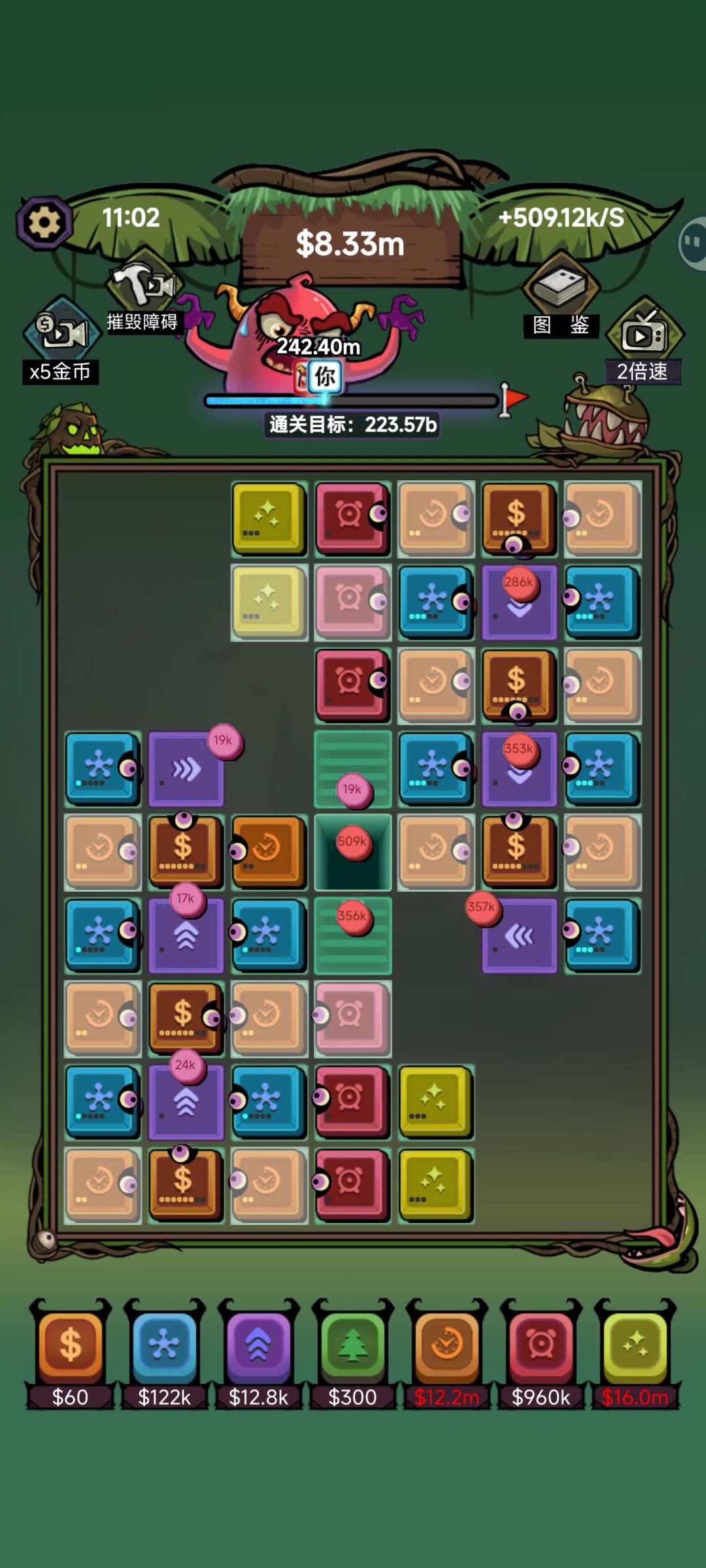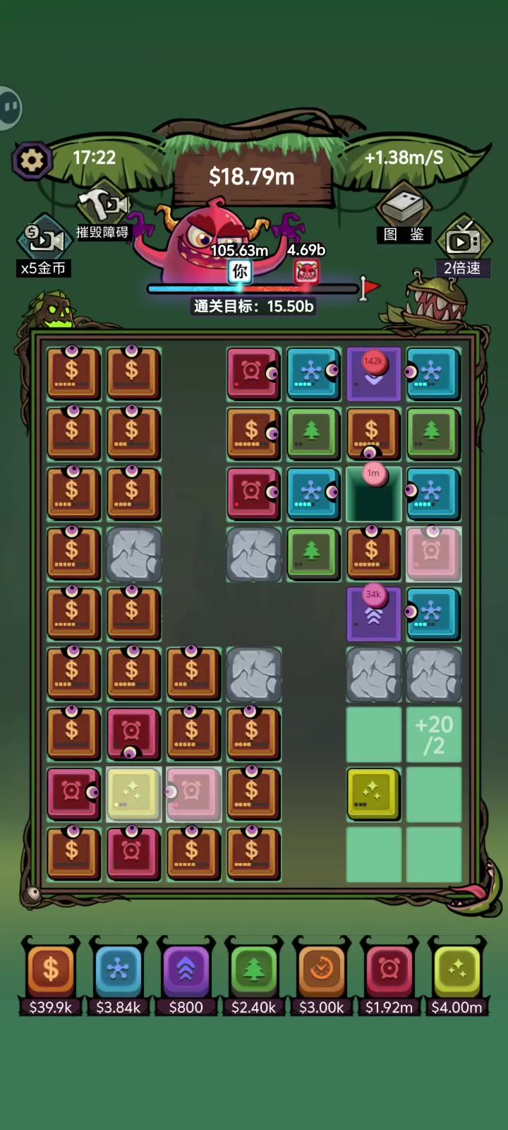 不看广告也是可以通关的,就是前期比较坐牢,看去石头的广告就足够,否则地图资源利用起来比较困难,不看广告前期就蹭+几的格子 旁边摆个核心,然后去养可以共同享用的一个工厂,加钱格子打工存到3K后加速给可以双吃的工厂,然后核心和工厂可以直接提升获得钱时,憋一下先升,不要先去选超频加速,第二个超频给核心收益高很多,有全图了拆掉加速的超频可以省钱,核心开不到1.6b的时候,多核心吃同一个工厂就是核心,后面给