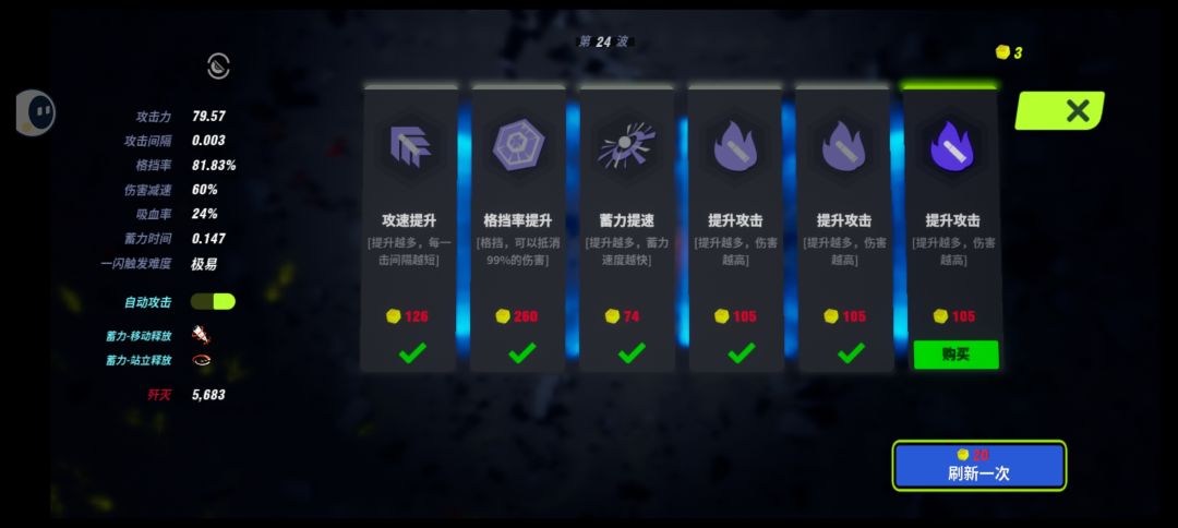 先难后易,但都太极端了。前面随便拿攻击和吸血,不用刷不拿攻速和减速,没有就存钱,第三个关拿个穿甲或者雷刀,然后拿2-3个守卫生基本成型,然后拿攻击吸血,有一闪拿一闪,后面钱多了拿锤子然后就无敌了[表情_吃瓜]。直接冲人群砍不掉血的。 游戏有潜力可以拉拉投资,多做一些内容。