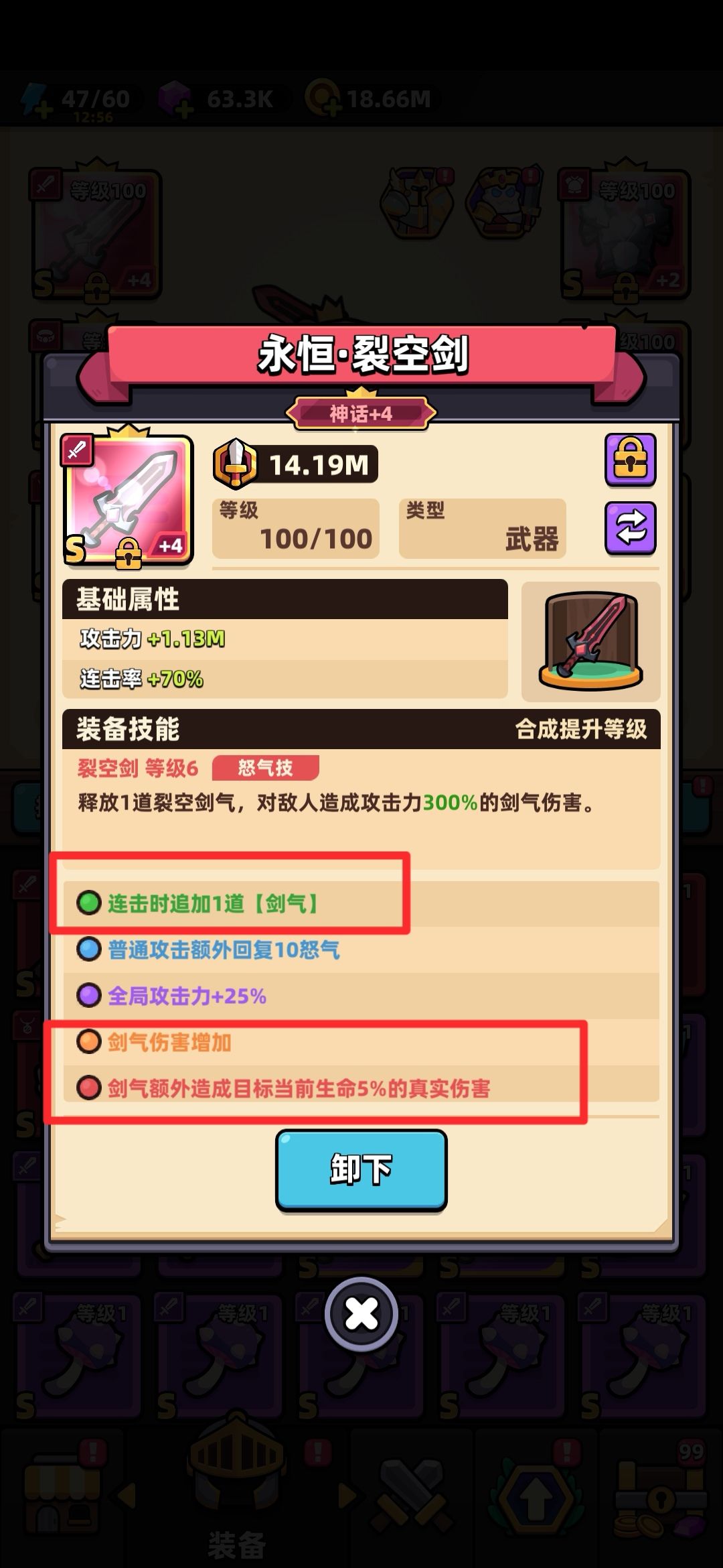 首先感谢本公会A佬的素材。 ①为什么都推荐氪佬玩裂空剑,在有了老虎+天之痕后,裂空剑的伤害无疑是爆表的,普攻+剑气+连击剑气三重伤害,尤其是看到砍怪满屏伤害的时候,仿佛不是在玩卡皮巴拉,而是在砍传奇😂 (但裂空剑不推荐平民玩,因为装备烙印坐骑神器基本都是固定的,需要大量氪金。) ②裂空剑满连击率: *红裂空50%连击率,每+1阶+5%连击率,红+4阶+70%连击率 *启用小骨传承【骸骨新兵】+10