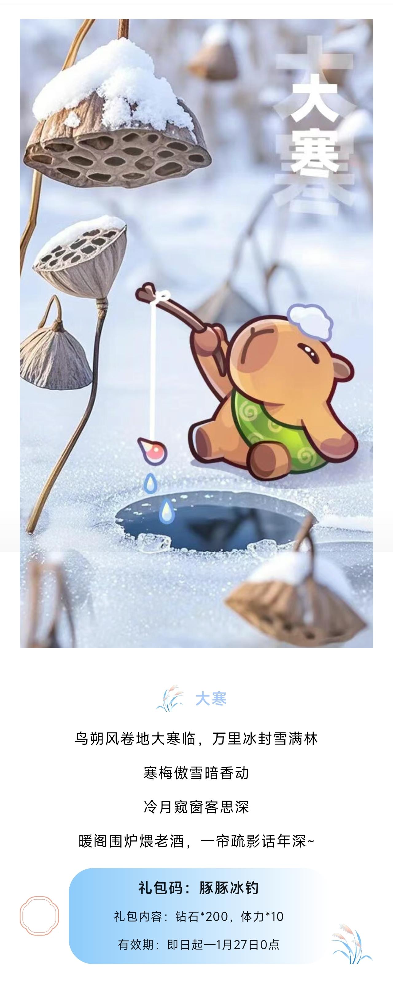 如题。另,大寒是二十四节气中的最后一个节气,标志着一年中最寒冷的时期即将到来,同时也是临近春节的时节。大家可以吃腊味糯米饭、八宝饭或消寒糕哦;家里也可以开始扫尘洁户,除旧布新了。