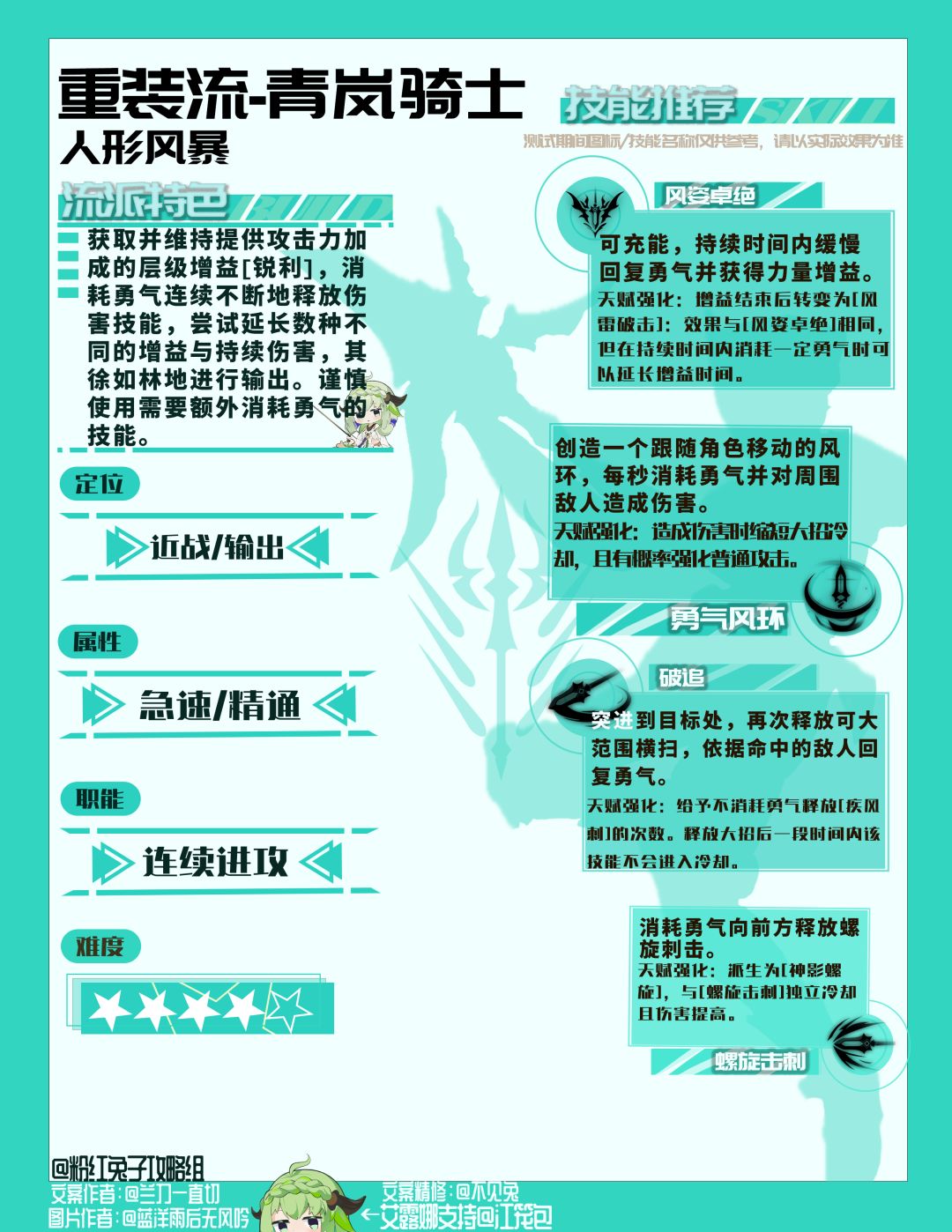 大家好,我是阿策。[表情_暗中观察] 本期带来的是青岚骑士重装流的玩法 这个流派主要是依靠各种手段获得勇气来进行输出。 专精技能我推荐带: 风姿卓绝(回复勇气、增伤) 螺旋击刺(消耗勇气输出) 破追 (回复勇气) 勇气风环(持续消耗勇气输出) 在天赋(风舞轻灵)作用下,满锐利4层情况下我们每秒回复的勇气达到了11点, 在有急速的情况下将更高,而勇气风环每秒消耗16点意味着我们不消耗勇气情况下将可以