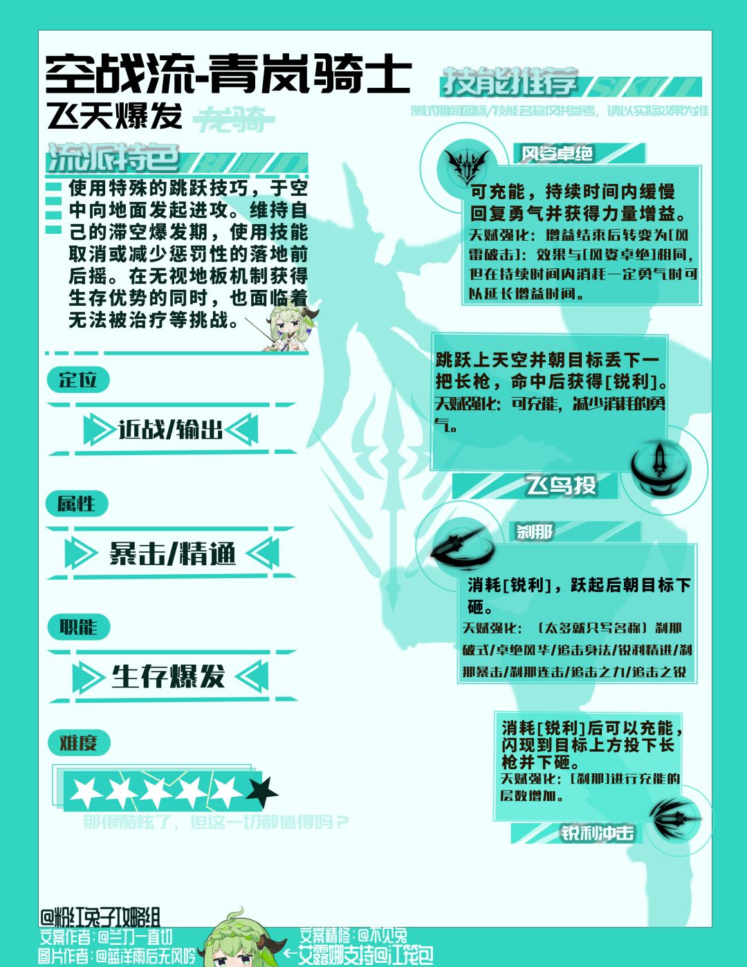 青岚骑士 流派:空战流 定位:输出 适用武器:长枪 难度:★★★★★ 主要属性:力量,暴击,幸运 以翔反为主要攻击,增加锐利的获取效率,更高频率释放刹那,获得勇气值。 01.技能所需(单个) 升级所需:113000卢诺 技能进阶:118本技能书 技能推荐 风姿卓绝、飞鸟投、刹那、锐利冲击 风姿卓绝 震慑前方敌人并造成伤害,效果持续15秒,期间持续回复勇气值并增加攻击力。勇气较低时释放,