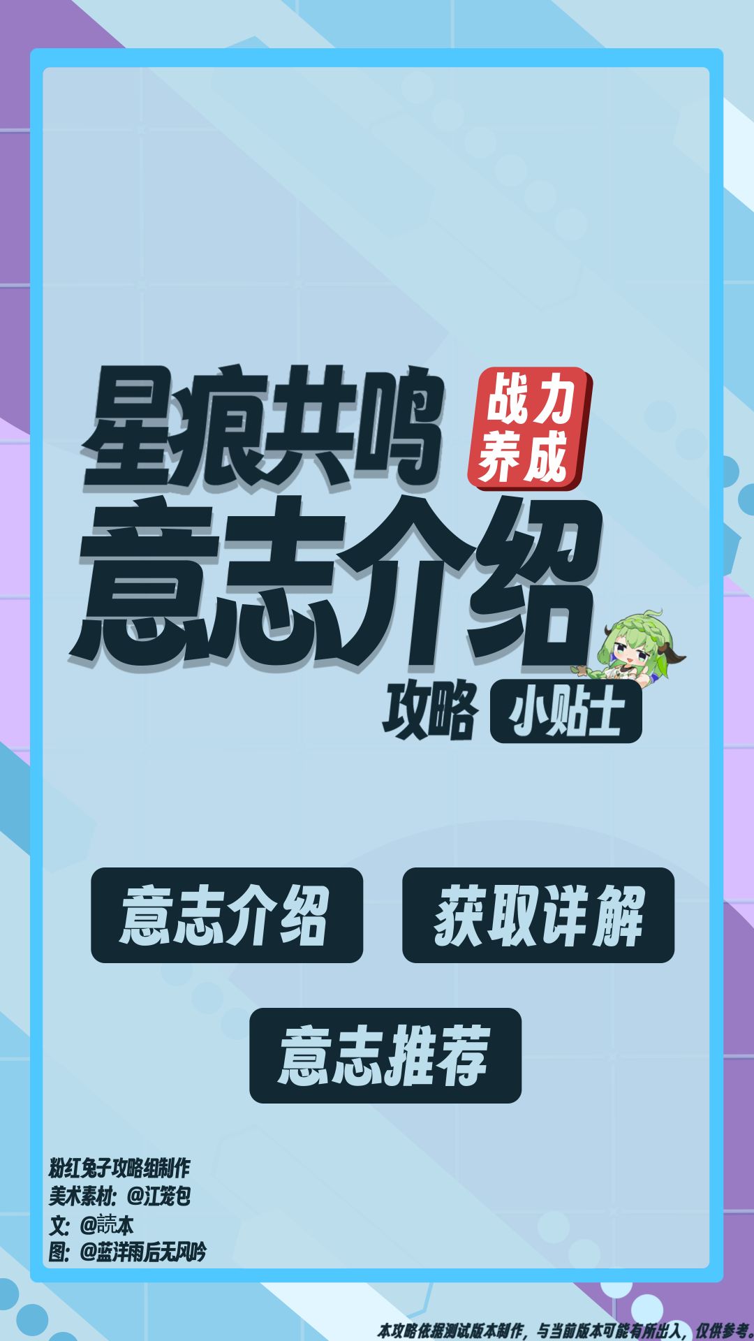 #星痕共鸣 你需要知道的一些小知识: 1.成品(即能直接在背包内使用)的战斗幻象可以在所长梅森处分解,可获取制造所需要的全额材料,也就是说,游戏初期赠送的意志三选一箱子是可以分解并使用这些材料制作一个你更需要的紫色意志的,还请考虑后再开启这个三选一箱子 2.意志文本中有提到”召唤”或是”变身”为XX,召唤通常来说意味着不会占用过多人物的动作帧,而变身往往伴随着较大的硬直,人物可能会在数秒内陷入无法