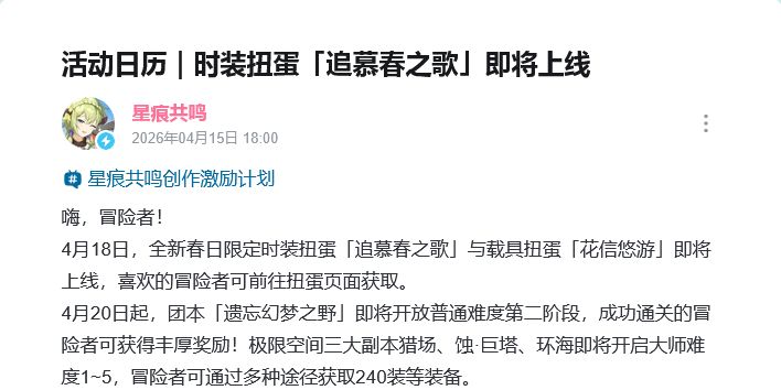 🌸 星痕共鸣春日时装上线!4月18日载具花信悠游同步登场 由上海宝可拉网络科技有限公司开发、腾讯发行的二次元MMO游戏《星痕共鸣》 近日有新信息传来,官方宣布全新春日限定时装扭蛋 追慕春之歌 与载具扭蛋 花信悠游 将于4月18日上线,此外副本内容也将更新 据透露,礼服时装突显春日氛围感,女生淡绿色蓬蓬裙层层叠叠,像裹了满捧的春日花苞,男生的同色系礼服清新利落,花艺装饰和金边设计细节感满满,#今天游戏圈发生了啥