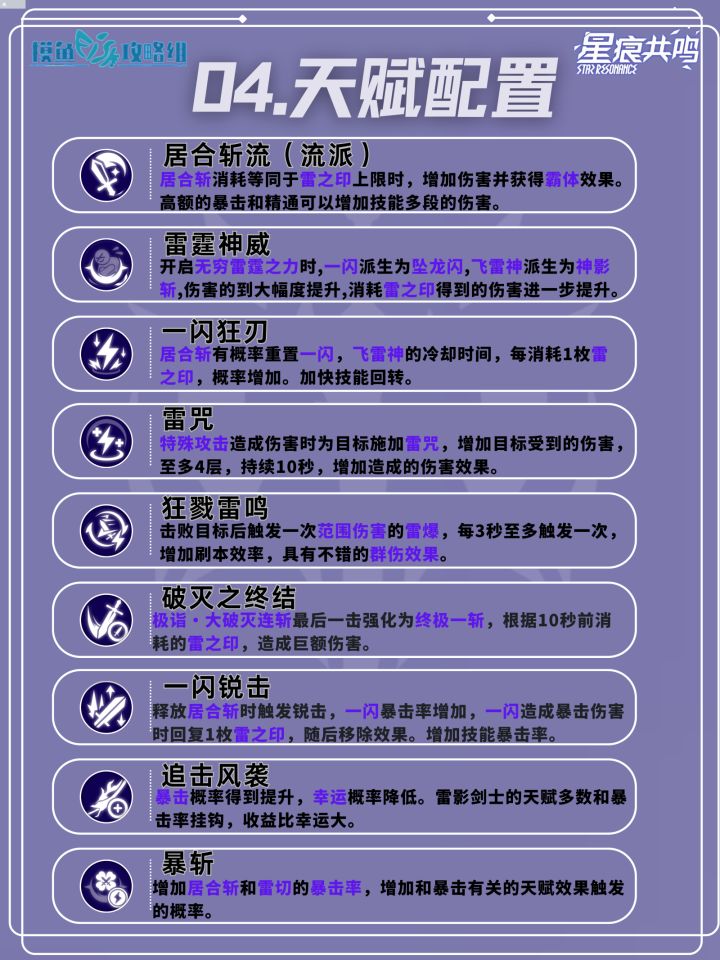 居合流对于暴击属性的需求较高,大多数天赋效果都与暴击挂钩,天赋上有暴击点暴击,没暴击就点居合斩方面的伤害强化。一闪和飞雷神通过派生强化后的技能伤害也较为可观,也可作为主要输出技能。居合流更适合单体例如BOSS类短时间内打出单体高爆发。*内容基于星痕共鸣创作体验服制作~#星痕共鸣 #蓝色协议 #星痕共鸣717不删档上线 #星痕共鸣攻略