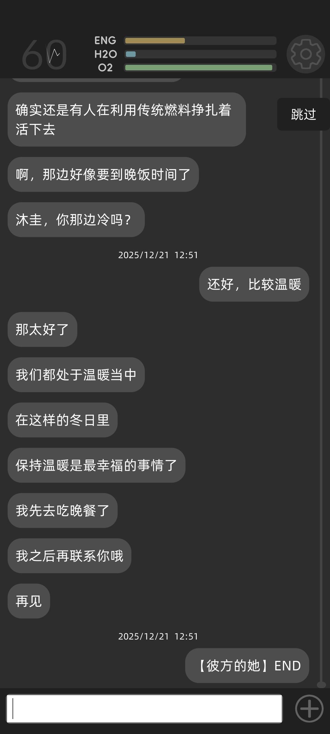 还有一件事,由于我之前说的沉浸感不大好,导致女主睡觉的时候我决定跳剧情去长视频平台云个剧情了,然后发现结局有点力不从心啊,还发现女主她爹的塑造十分甚至九分的像龙脉常歌里艾妲的师傅红啊。我自己前面玩的时候发现这游戏的剧情也很剧情杀,氧气问题就不提了,第一天我就看水槽的值就不多了,结果女主还不紧不慢说能洗个澡,要搁个男主发现设备坏了,肯定第一时间就开始清点物资数数自己还能苟多久,后面能源也就随着掉下去咔的清零了,我用脚想都知道这完蛋玩意儿铁杯具了,最后我又想到了一个游戏,唉~叫王权~也是选项游戏,但纯数值,咋不借鉴一下。另外我前面说输入主角名叫李莫结果没彩蛋很失望啊(