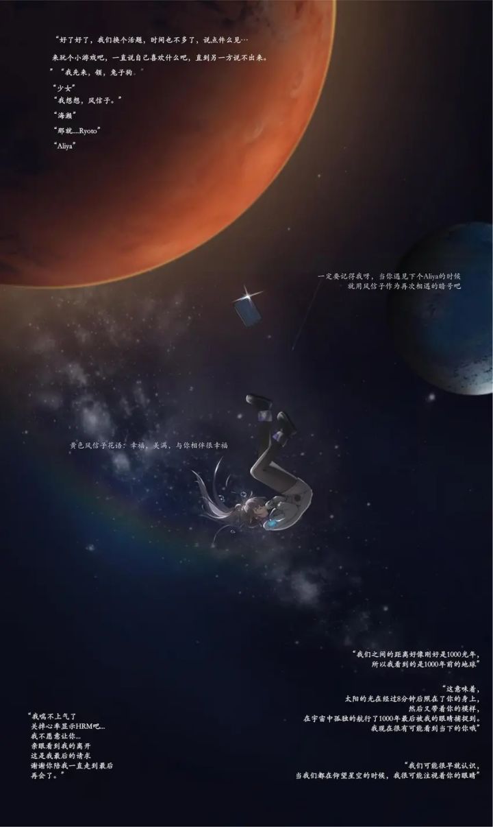 你知道吗? 我们之间相隔的距离好像刚好是1000光年 所以我看到的是1000年前的地球这意味着 太阳的光经过8分钟后照在了你的身上 然后又带着你的模样 在宇宙中孤独旅行了1000年最后被我的眼睛捕捉到 所以说啊! 我现在很有可能能看到当下的你哦 因此,我们可能很早就认识 当我们都在仰望星空的时候 我可能正在注视着你的眼睛。 #宝藏游戏安利派对 #steam移植 #游戏安利 #游戏推荐 #文字游戏#剧情