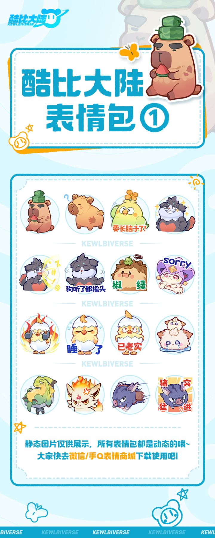 亲爱的引路人!「酷比大陆①」奇兽表情包上线啦!欢迎各位引路人前往【微信&手Q表情包商城】下载使用哦!如你所见,这就是憨包奇兽们的趣味日常!这么可爱不常驻在我的聊天框怎么行!皮小汪这么得意,肯定是又偷偷使坏了...小鸡智今天聪明了吗?一边吃瓜一边顶瓜 除了顶瓜瓜还有谁...#酷比大陆 #酷比大陆摸鱼测试