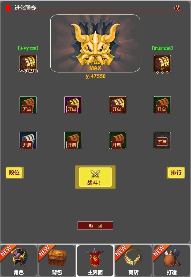 联赛为后期重要玩法,20次进化后开启 联赛玩法说明 联赛玩法主界面 每周联赛赛季宝箱(奖励内容随联赛等级提升) 胜利宝箱,每胜利3次可以开启一次 战斗宝箱,每次战斗胜利后都可以获得战斗宝箱。 每个战斗宝箱会占据一个宝箱位,倒计时开启或使用钻石开启 宝箱共为4个等级(青铜、白银、黄金、传奇) 周一至周六随活动不同奖励积分不同,周日为金币 宝箱必出3份奖励,1份资源、1份战功、1份装备或者卡片宝箱奖励