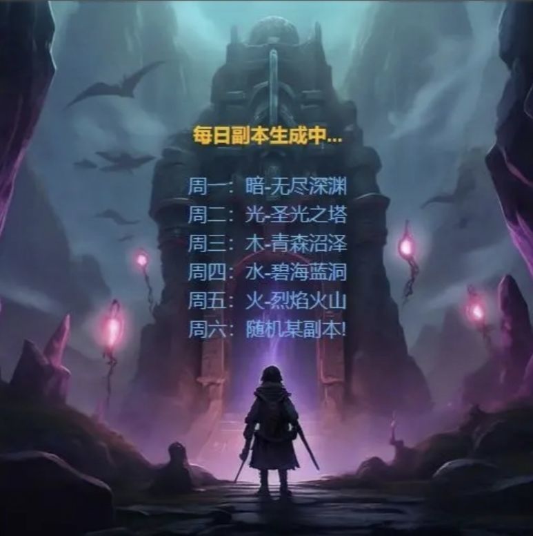 【活动-每日副本】简介 [每日-副本类型-周日无副本]【每日副本掉落积分】简介: 日期 属性 副本名称 掉落积分 周一 : 暗 - 无尽深渊-深渊币周二 : 光 - 圣光之塔-圣光币周三 : 木 - 青森沼泽-青森币周四 : 水 - 碧海蓝洞-碧海币周五 : 火 - 烈焰火山-烈焰币周六:随机副本周日:无 【进化联赛掉落于每日副本掉落积分关联】: 【进化联赛-宝箱开启掉落物】举例:周二为圣光之塔副