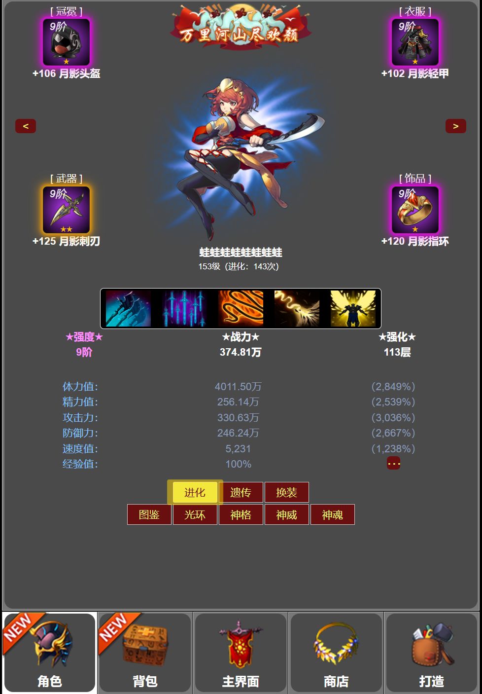 刷开局:在主界面-系统,在推广里面填写推广码SYWFQNUQ可以领取10万砖石,然后在设置里面输入礼包码jhzl666(密码还是jhzl666),加群礼包jhzl999(密码还是jhzl999),公测礼包jhzlgclb(密码还是jhzlgclb),够30万钻石开三次10连抽3到6阶装备,最好抽到6阶武器开局。 进化之路:每次升级后,点到打不过为止,这样经验多。 技能升10星:5次靠技能结晶,
