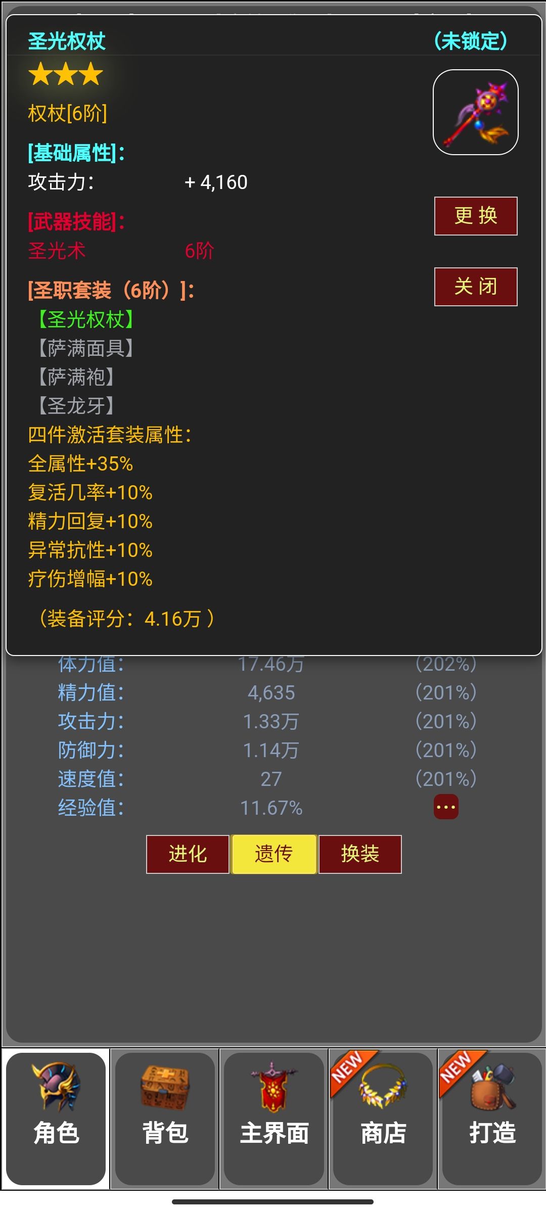- 【圣灵权杖4件套预览图】 【圣灵是4件套装备图标展示】 - 【圣灵权杖4件套装激活图】 【4件套属性激活图】 - 【圣灵权杖武器技能】 【武器技能-圣光术技能预览】 - 总结 : ❶【圣灵权杖】属于免疫牧师型装备 ❷【圣灵权杖】同数值偏克制【神魔巨剑】(战士) ❸【圣灵权杖】特殊属性偏加点于 [复活几率] 100%开局多一条命(50%体力) [精力恢复] 恢复精力值,影响技能释放 [疗伤增幅]