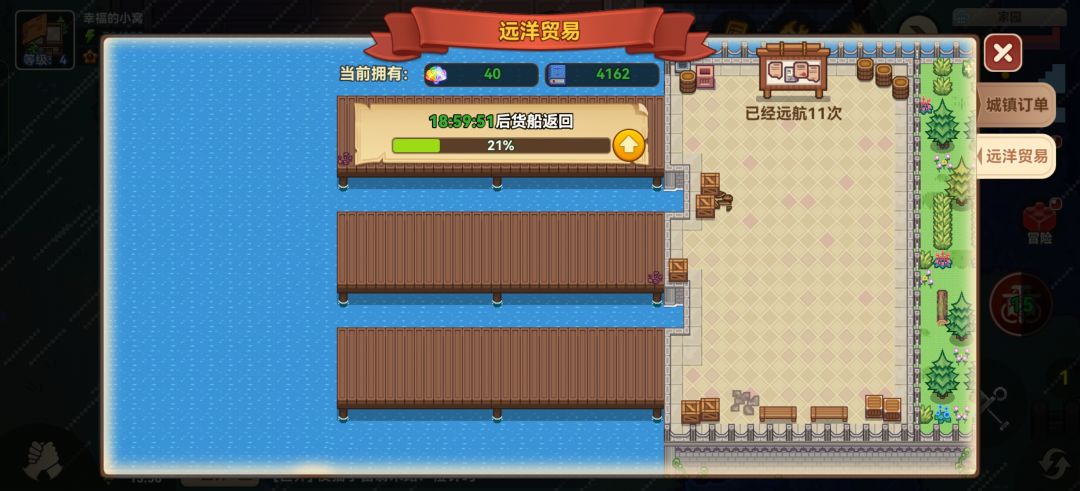1 家园的远洋贸易是黑星奖章的获取重要途径,但是远洋贸易时间很长基本一天,而这游戏的刷新时间是 5 点,如果 5 点船没回来,那么今天的远洋贸易就被顶掉了,船回来也不会刷新,建议每天睡觉前把它加速领取掉 ,家园小店时光鸡 20 钻石买航海加速,能用两天每天 10 钻,10 钻换 3 个奖章很赚的。 2 每天一定要先领取威望任务在去清理每天要做的事情,有一些就只能做一次,你没领任务今天就完不成了。还