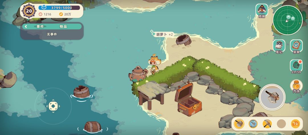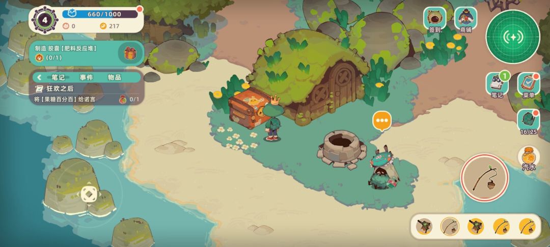图一,宝箱拿钓人竿。 图二,记得摇铃铛和踩梦境。 图三,买一个稿和一个石斧,手残可以买点易燃凝胶。 图四,用稿子挖,可以拿时间石。 图五,与洛言对话,拿木剑。 图六,记得回去升级技能等级,好拿二级石斧。 图七,去汇流岛刷兔拿凝胶(梦境概率出符文<合剑可以用>和兔肉)。 图八,汇流岛拿剑刷,嫌慢拿易燃凝胶炸。 图九,和鲁斌对话,要去崎岖石滩岛砍椰子树。 图十,去崎岖石滩岛。 图十一,梦境崎岖石滩岛砍