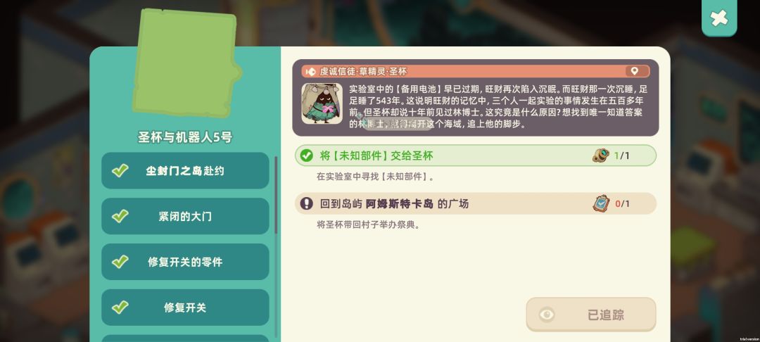 图一,找到圣杯对话。 图二、图三,找到这个机器人五,这里需要两百金币。 图四,两个倒地的机器人对话拿书。 图五,来到门闸这里提交零件。 图六,来到宝箱这,开箱。 图七,解锁尘封门之岛秘境。 图八,再次和圣杯对话。 图九,和机器人对话,这个时候拿走电池。 图十,进门后与圣杯对话。 图十一,走到这个装置里。 图十二,到这个位置拿宝箱。 图十三,领取这个。以后可以挂在船上。 图十四,来到门阀开关打开,然