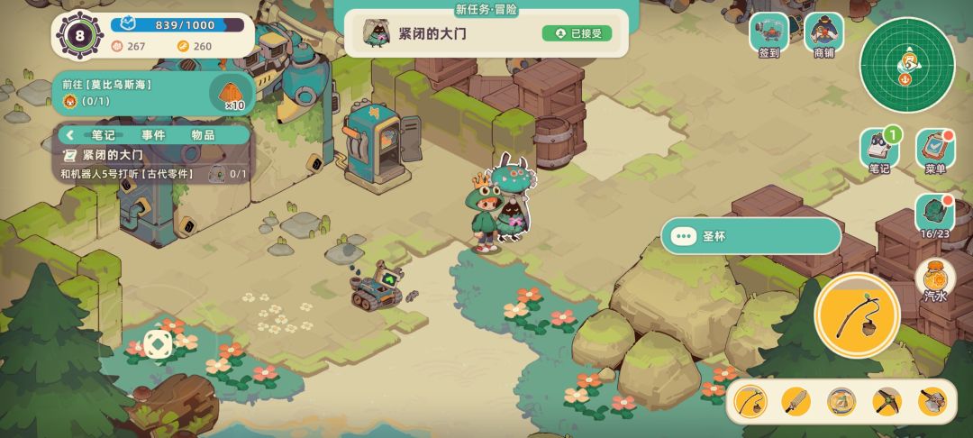图2,水井拿钥匙🔑。 图3,屋子拿书。 图4,摇铃铛买东西。 图5,记得买木板和钓鱼竿(每日刷新10个) 图6,这里点击金字塔,才能遇到精灵。 本攻略只适合查漏补缺。 #寻海之旅TapTap测试版