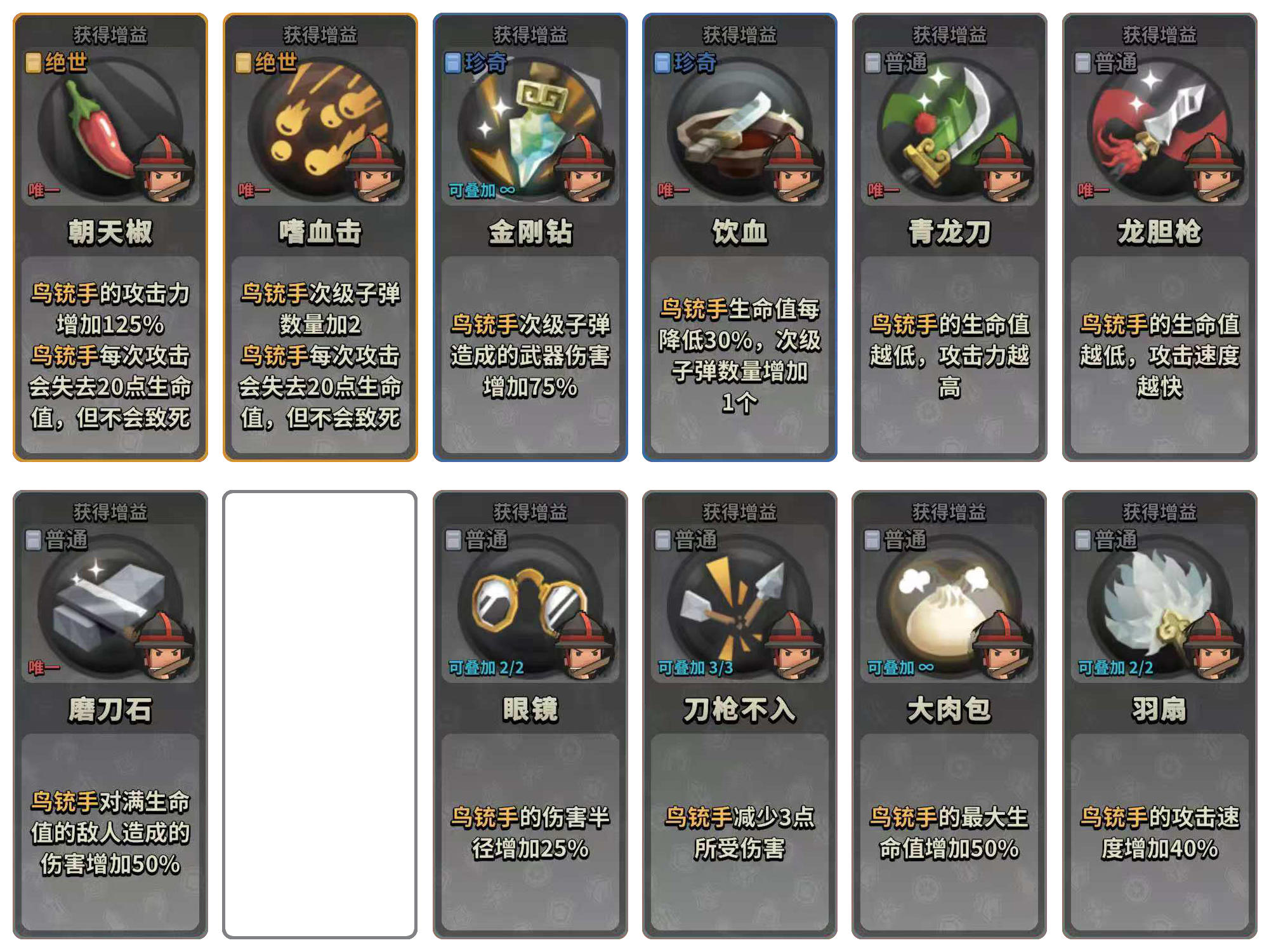 1.20版本,目前新卡有误无双卡 1鸟铳手,2一窝蜂,3剑客,4机关伞 5御林铁骑,6女巫,7道姑,8墨灵塔 1鸟铳手2一窝蜂3剑客4机关伞5御林铁骑6女巫7道姑8墨灵塔绝世卡 1火炮手,2重骑兵,3投石车,4法师 5猛火油车,6刀客,7吹箭墨灵,8墨将军 9松鼠游侠,10青霜,11红袖伞,12持棍僧 13道士,14红衣大炮,15机关弩1火炮手2重骑兵3投石车4