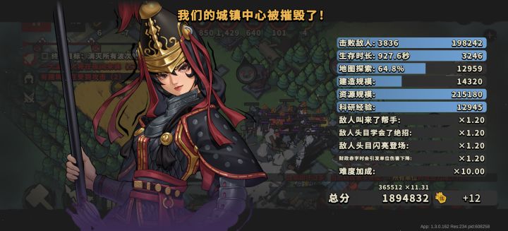 这一次成功提前造出最高级城墙,敌人从三个方面进攻,下面的用3级城墙和红衣大炮挡住了,上面的两个方向,其中一个方向用最高级城墙和掷弹手挡住了,另外一个有Boss的一波,三层最高级城墙还是没挡住,然后就是建筑被毁,士兵实力被削一半,玩不了了