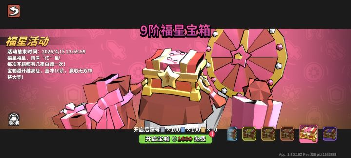 福星箱子每次开启后下一次均有几率免费 这个是我开了一轮的结果 一星10玉, 1蓝10白 二星50玉,5蓝25白触发免费 三星100玉,1金5蓝25白 四星150玉,1金10蓝44白 五星300玉,2金24蓝54白 六星500玉,1无双4金42蓝48白 七星800玉,5金53蓝62白 八星1200玉,7金86蓝98白 九星1600玉,10金103蓝76白 十星2000玉,1无双10金94蓝。触发免费