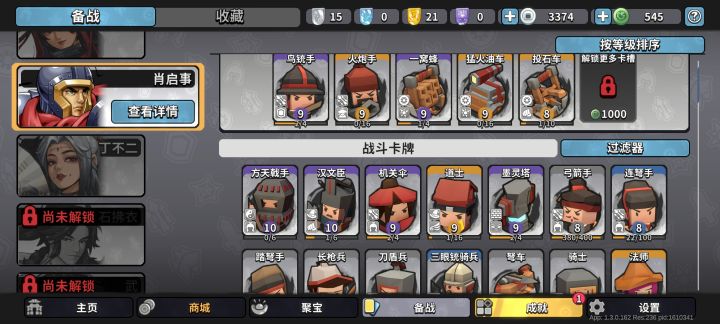 日常篇一、没时间打5次拿箱子怎么办?找图①(6-10)这种战役地图打。不用建建筑,拆了外面围墙后就中间一个小圆圈。本图自带的机关弩可以解决所有敌人,剩下的带4个杂兵做成就。如果成就不想做,参考下面3楼评论,更高效。二、没钱升级卡牌怎么办?竞技场→娱乐→十面埋伏三、聚宝要注意什么?①战役模式通关后,兑换星星可以提高奖励②买皮肤,原始皮肤被好友领卡,自己会损失对应数量,其他皮肤不会。最