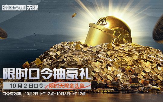 假期上暗兑好礼!10月2日限时福利口令码发布:限时天降金头盔口令有效期:10月2日中午12点-10月3日中午12点先锋们只需扫描图片内二维码并输入口令,即可兑换福利!每日将有1位幸运先锋获得【4张赛季典藏进阶手册激活卡】,等于免费领取一整年的赛季典藏进阶手册!各位先锋请注意:● 请各位先锋留意每日发布的口令码兑换时间(海报中有标注),超过兑换时间将无法在页面进行兑换;● 每个口令码每个角