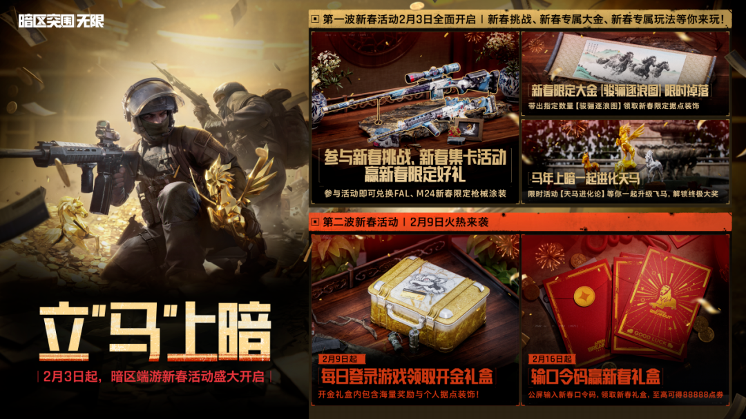 全体先锋注意,新春突围篇章即将奏响!第一波丰厚福利定档2月3日全面启动,请各位先锋做好准备: 立“马”有礼:参与新春挑战、新春集卡活动即可兑换FAL、M24新春限定枪械涂装;立“马”有金:新春限定大金【骏骊逐浪图】限时掉落,带出指定数量骏骊逐浪图即可领取新春限定据点装饰;立“马”起飞:全新限时玩法【天马进化论】等你一起升级飞马,解锁终极大奖! 而这,仅仅是开篇!更重磅的第二波新春福利,