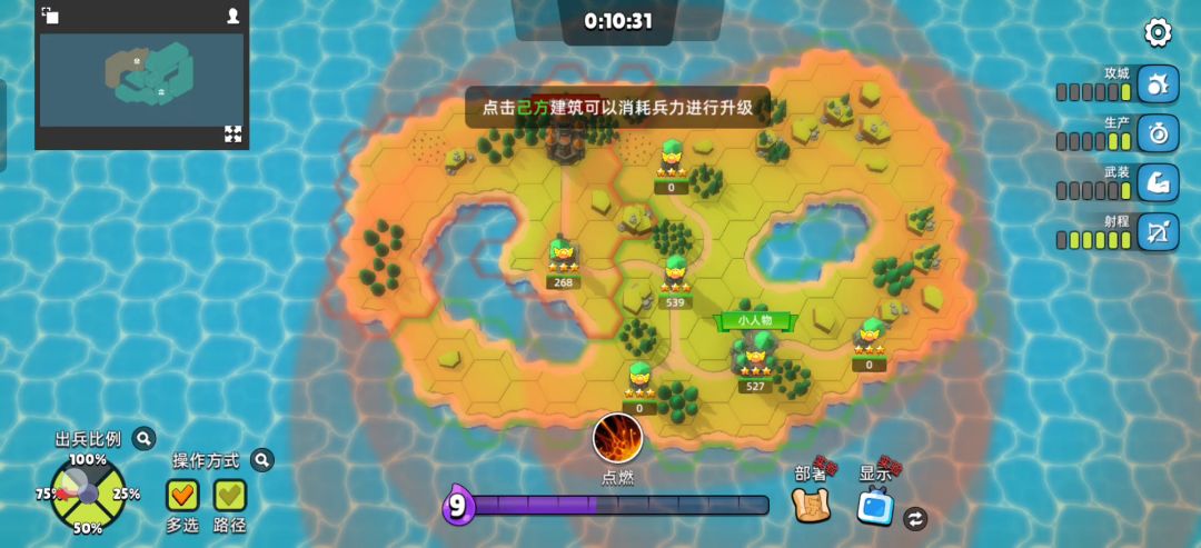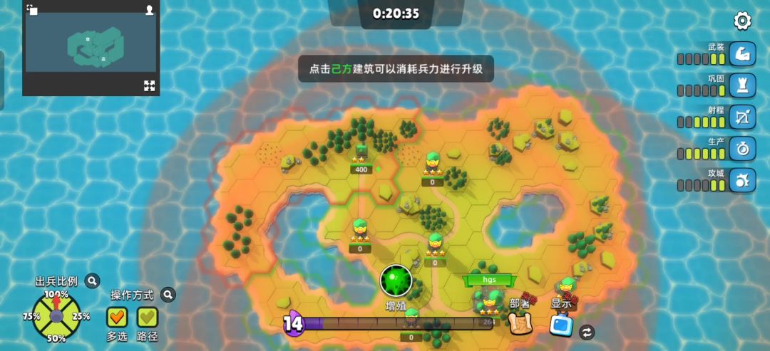 开始从一个箭塔一个中间房子拉兵到角落,4个角落全部都拉。然后设置定时出兵到每个路口第一个房子,升级成碉堡,升级完毕后设置定量200出兵,因为可以方便留点兵让我们好快捷升级。设置完毕后就可以在右边快速升级。然后把兵给到箭塔里面,把箭塔也做成房子出兵。然后在商店里面买加防御的给四个角落的碉堡。然后技能首选生产兵力防御迅捷。到后面每个房子至少都可以有1000多兵力。然后设置定量1000出兵。可以不那么卡
