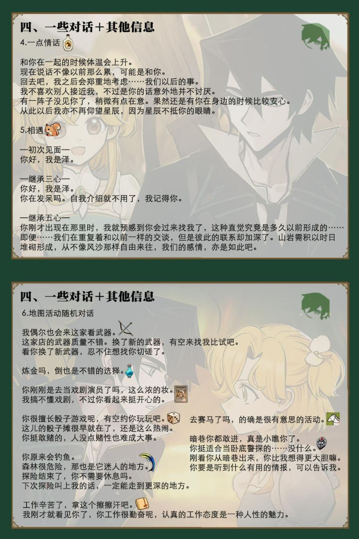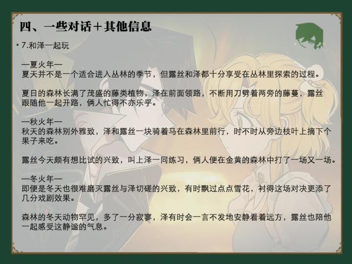 大部分图片第一次点开都糊糊的,需要加载一下,退出图片再点击图片,会变得清晰很多P1-P3:女儿心事的选项P4:大师课归类P5:春火年讲故事属性P6:舞会NPC话题(有两个不太准,已更新新版在〈46楼〉)P7-P9:邀约NPC话题选项#火山的女儿再度重逢 二编:楼下有NPC赠礼〈2楼〉,新增战斗伙伴技能〈9楼〉,女儿聊天回复〈10楼〉,NPC信件回复〈11楼〉,有需要可以留言,能找到的会