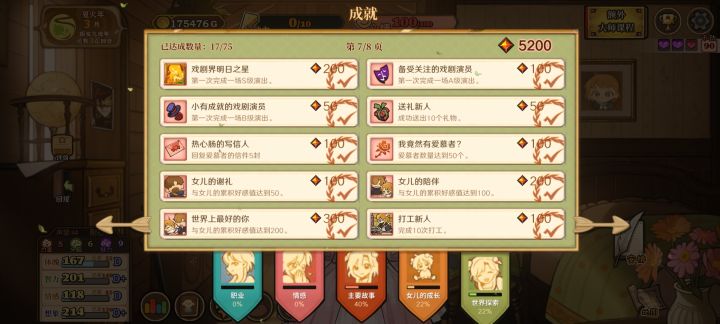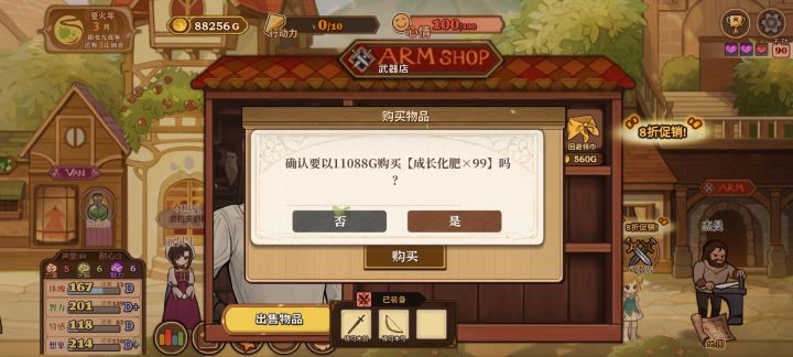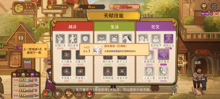 就图上所示点了甜言蜜语天赋然后等“三四月份”打折买卖就行,铁匠好感的话注意别点认识就行,不小心点到的话就当前回档,然后有了钱和肥料就种小麦这样就可以无限体力了,然后刷四维的话,可以先刷下干劲再读书划船什么的,就是成就栏,世界探索那里的大多完成后会加干劲,叠个两百左右干劲就差不多了,这样简单一点效率也会快很多,然后上三围的话,这个挺难弄的,稳定的方法是弄马奶做料理,看剧场三围随机加一点,冒险弄冰块冰