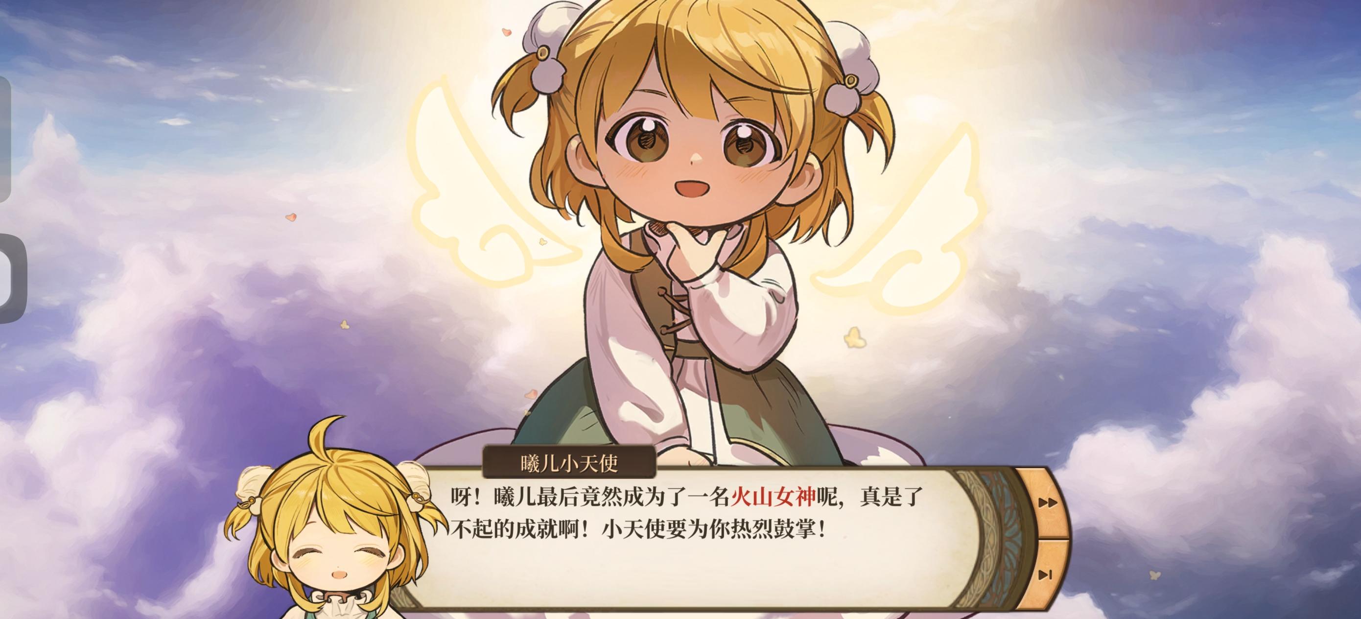 第一次玩,前面只有红毛,想着那就红毛结婚吧,结果半路杀了个泽出来,本人就叫泽啊,所以转了对象。女儿我就想着进化成牛逼弓箭手,所以几乎都在提体魄和力量,学习也是弓箭优先,其他顺便刷刷。每天除了每个人都对话,就是提升泽,红毛,雷贝莎好感。我以为结局能和泽结婚,结果啊结果,万万没想到,我打出了个啥结局啊——泽和红毛抢女儿,老妈是火山女神,还有个小天使姐姐,我服了。。。所以《火山的女儿》的意思就是