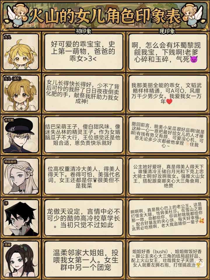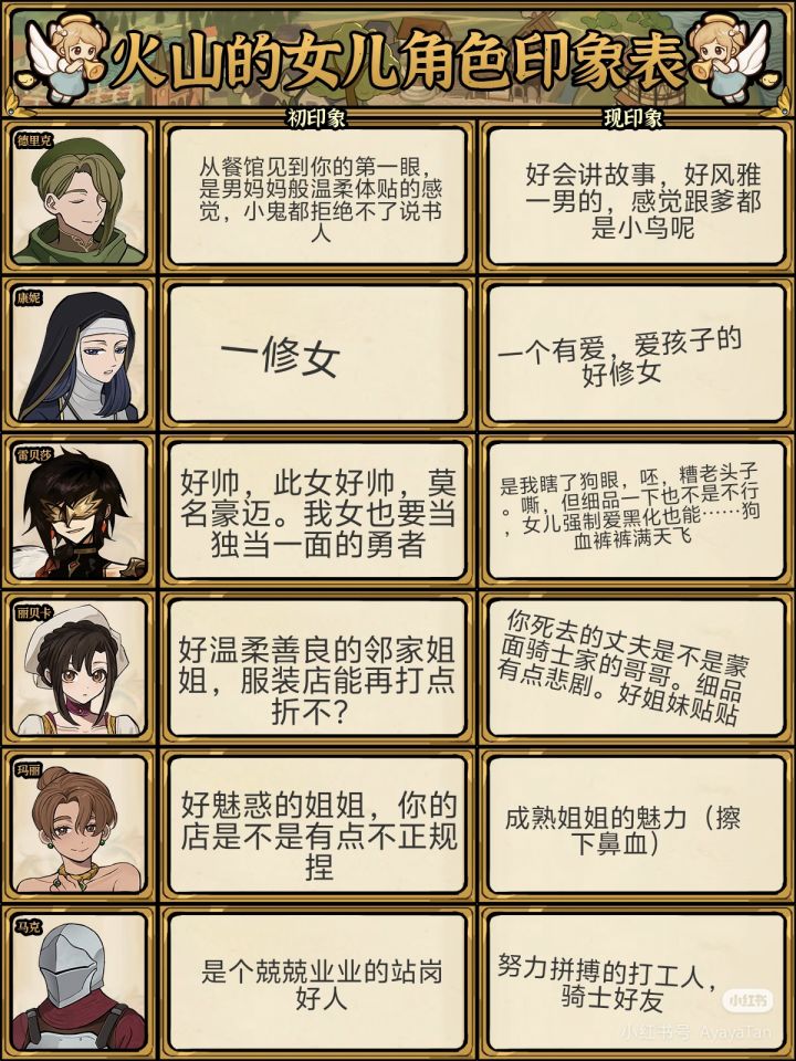 本来想打火山女神结局的,但好难就放弃了。优:1画风好看2人物互动挺有意思的3养成很有 成就感4风格很治愈性价比我觉得挺高缺:1玩法单一2单纯属性值的堆叠没有体验感3结局和养成过程不对应总的来说,已经比我玩过的大部分养成游戏有良心了。最后附上美美女儿的照片