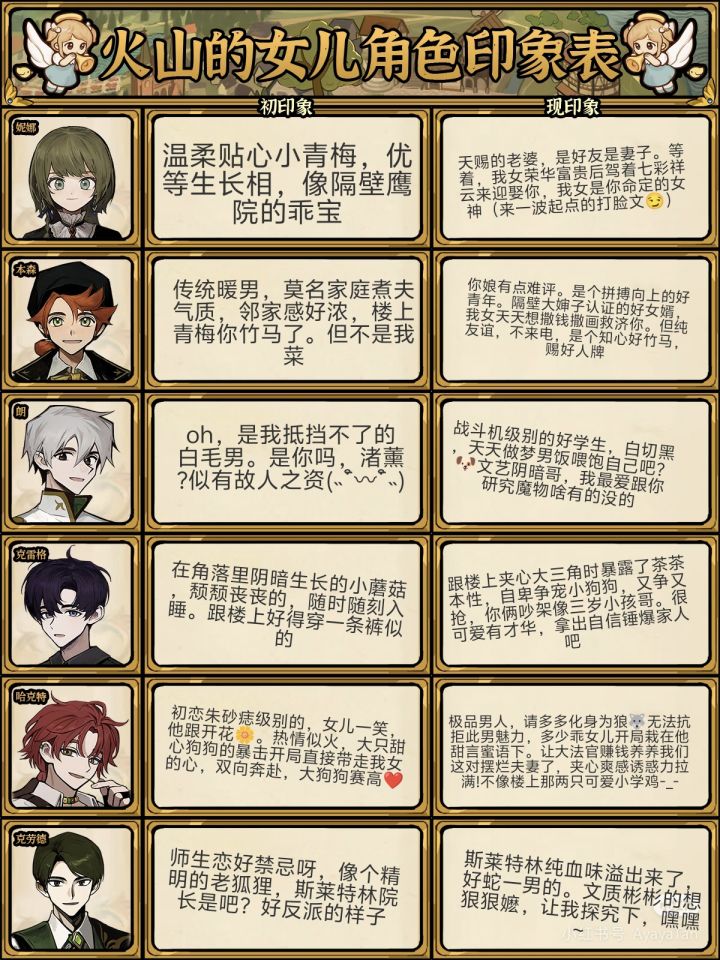 (印象表已经添加了主教,暗巷站街卖药郎,爹妈二人评价)三目通关了,快全图鉴了。真的超绝,一周目剧情懵懵懂懂,二周目恍然大悟,三周目全图鉴努力嗑。 女婿人选太多挑花眼,一眼挑中红毛大狗狗,热情四射,福瑞控大满足,跟着田园狗有饱饭吃(bushi),难以拒绝甜心爽朗大狗狗~请多多化身午夜的狼🐺泽是经典人设永不过时,老公王不是吹的,慕强癖只想当哥哥的腿部挂件,通通石化在大法官的大袍下吧。真的他是