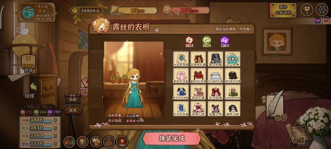 女儿全部衣服(成年版) 雪夜心愿:与裁缝(卖衣服的那个小姐姐)关系达到朋友送的 天鹅绒:第二次轮回才有,在封面——继承——新衣服加成选择后出现。 火山女神:第二次轮回开局没多久送的 使者的衣服:打工打到最后工作解锁送的 #火山的女儿手机版