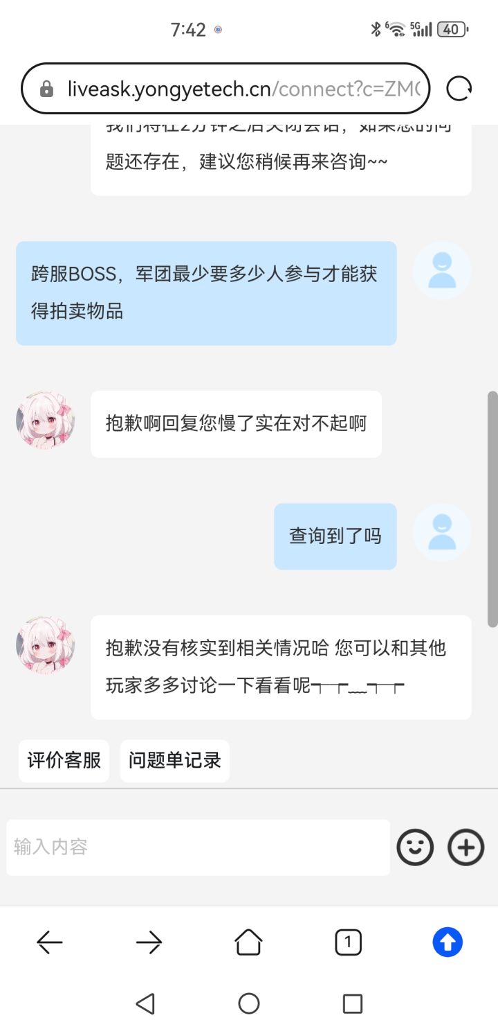 自己做的游戏,问客服军团里多少人参加跨服Boss才能出拍卖物,客服竟然说不知道,让自己找人讨论,这客服估计都是后台机器人吧