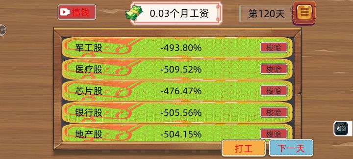 挺无聊的,上啊里直接玩困难模式其实抓住底部反弹来玩基本上反转就走。100 的基数去玩没次个 3% 不打长期随便循环复利。就是这个游戏他会不断挑战你的风险防线。抓的越久亏得越多,然后呢你就会想我在什么什么早点卖出就好了就不会亏这么多了,然后试图找一个心里内心可以接受的相对低点说服自己出场 。就是原来亏 50 现在只用亏 20 了赶紧走赶紧走。其实你在它亏 1~5 的时候马上走都不用亏 20,(这叫及时止损)就是这种数字低你看不上,你觉得你还能承受。以为有转机心里想说不定一下就赢回来呢,其实不然直到亏到 50 的时候你才想要跑。晚了,然后就暗暗认为等会亏少一点的点再跑,就不用亏这么多了。然后越亏越多。一直反复这样,直到真的觉得无力回天,事实打破自己的幻想之后无奈离场。这游戏也是把股市的心理反应的淋漓尽致了。