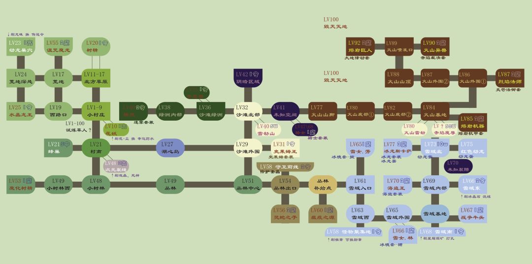 如题 村庄初始地图 草原突破十级与20级的地方。 荒地1龙心脏任务刷金币 荒地2 刷龙珠换boss传送票(重复任务列表) 村南 裂缝+宠物 湖心岛 右边 蛇女 再右边史莱姆(史莱姆需要传送票) 花妖(boss出葬花弓 3连射+1%的几率秒怪) 树精(出树王夹甲 每秒回1%血量) 飞龙(纯废物说是出那个什么晶忘了) 史莱姆(史莱姆剑 60概率吐泡泡 )