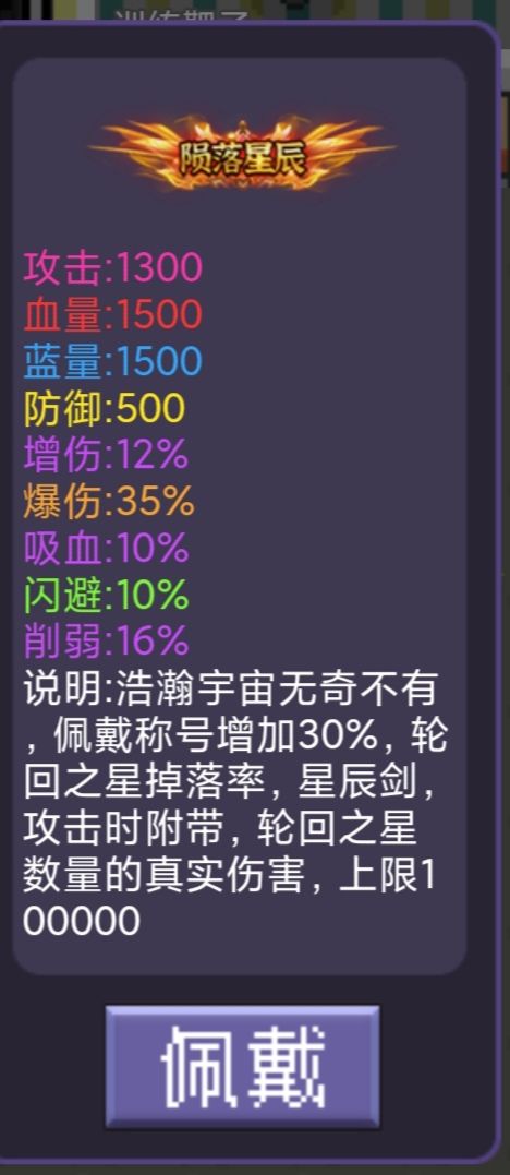 但是还是追不上赞助大佬,一个真伤需要轮回之星,一个只需要金币,2亿金币才能吃满,轮回之星时间需要的会很长,但是后期爬塔能强爬,挂轮回之星办法,连点器设定3秒点击两次,暂停界面点回城,需要配合空间背包使用,记得带上称号30%轮回之星掉率