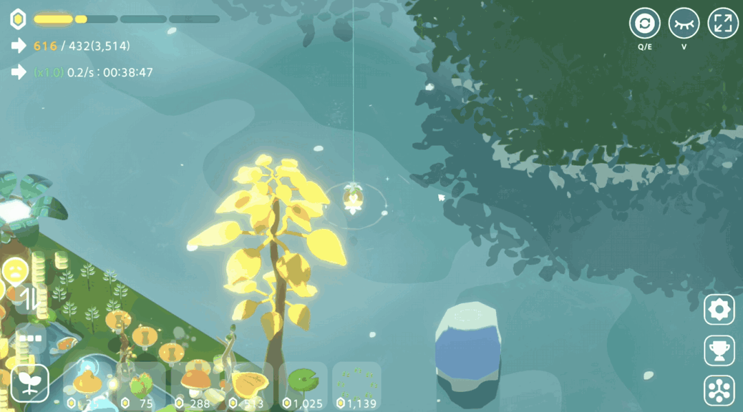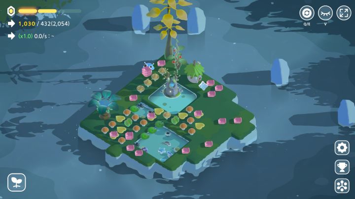 本作虽然作为一个模拟经营建造游戏,但是却摒弃了传统复杂的数值框架,同时加入了许多种各具特色的作物设计,并添加了挂机机制。游戏最开始会给玩家一座心形的小岛,岛上面散落着许多黄色的水晶和一个长着树的小池子(祭坛)。屏幕的左上角有个黄色的条子,这个就是祭坛的能量条,下面则是需要的黄色水晶数量。玩家通过收集(点击)水晶,来为祭坛充能,能量满了之后玩家长按祭坛,会掉落一个钥匙。