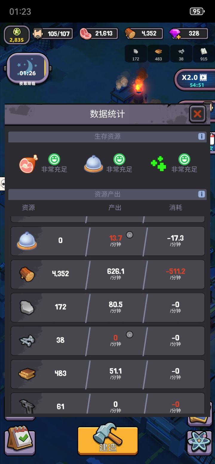 玩了2天 x2效率没有断过 还是严重资源不足啊!木板 矿 钉 这些物资只能看运气蹦出来 一次就几十完全不够用啊!