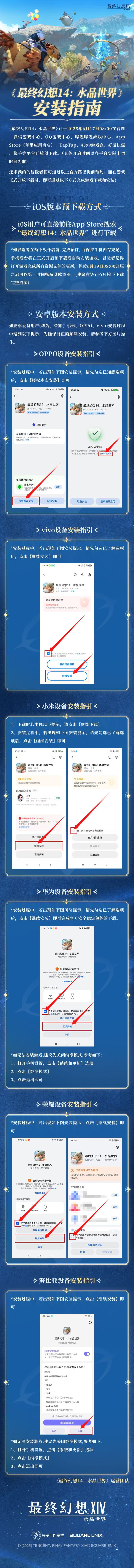 亲爱的冒险者:《最终幻想14:水晶世界》将于6月17日08:00正式开放下载!为各位冒险者准备了一份安装指南~请各位冒险者们查收~※特别提醒:不删档上线使用全新安装包,参与过历史测试的冒险者,请先卸载测试客户端,再前往下载最新的游戏安装包进行体验。✧官方社区小程序:QQ/微信搜索“FF14手游官方社区”即可进入,找亲友、抓策划、独家福利等你领!※如无法打开小程序,请将QQ更新至最新版本后重