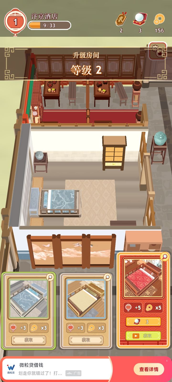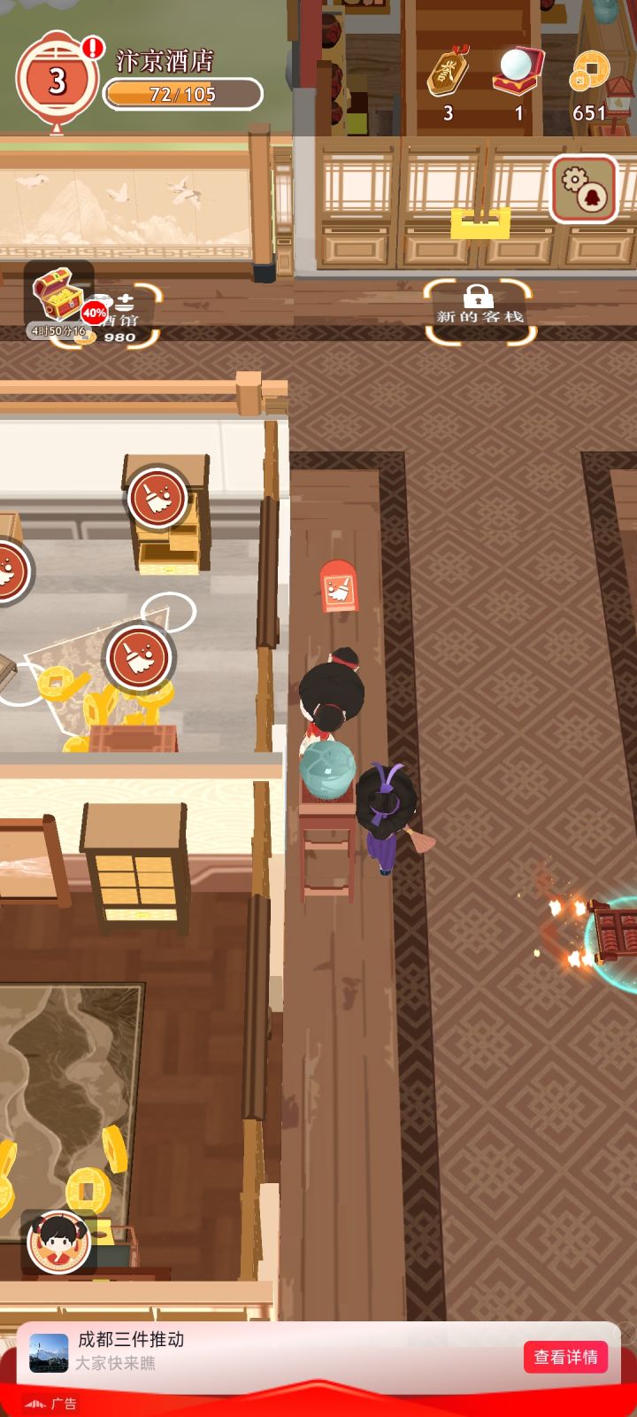 主要是酒店设施的升级,每一个房间都可以升级,所需资源都是固定值,有点像小游戏和某些轻度游戏数值结构,以需求跳变来增加游戏时长。